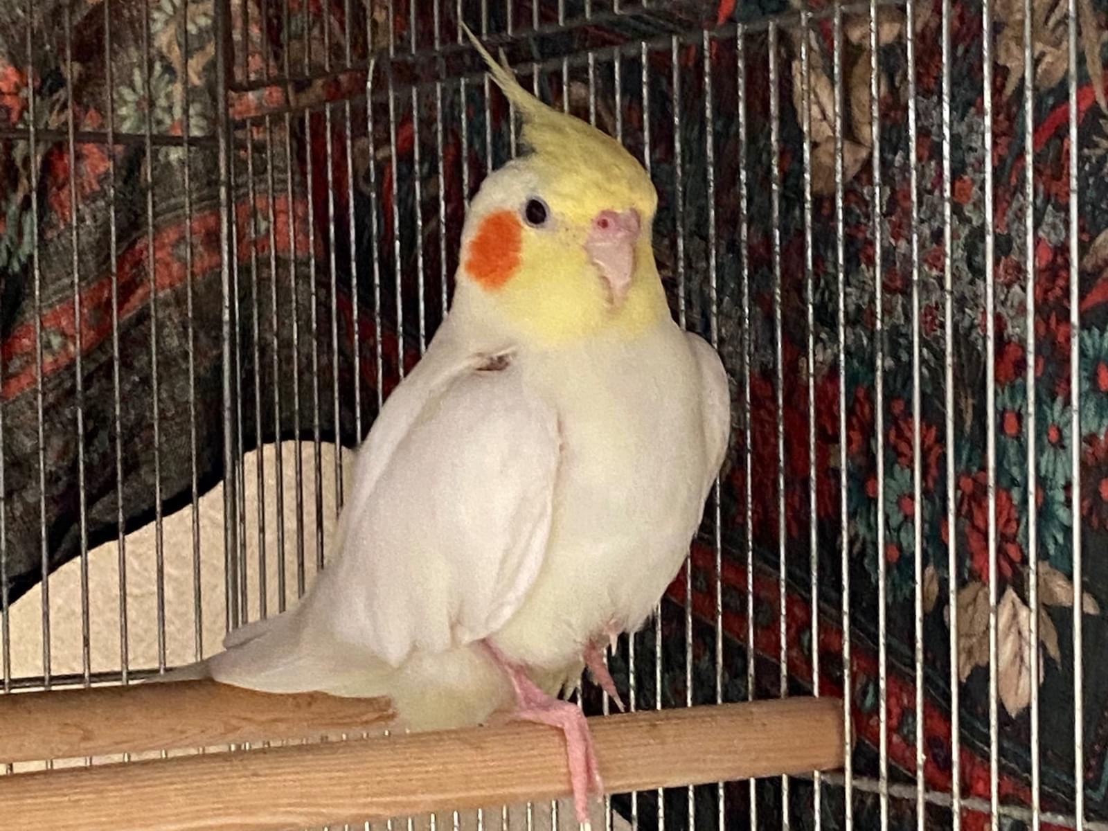 黄色と白のメスのオカメインコ