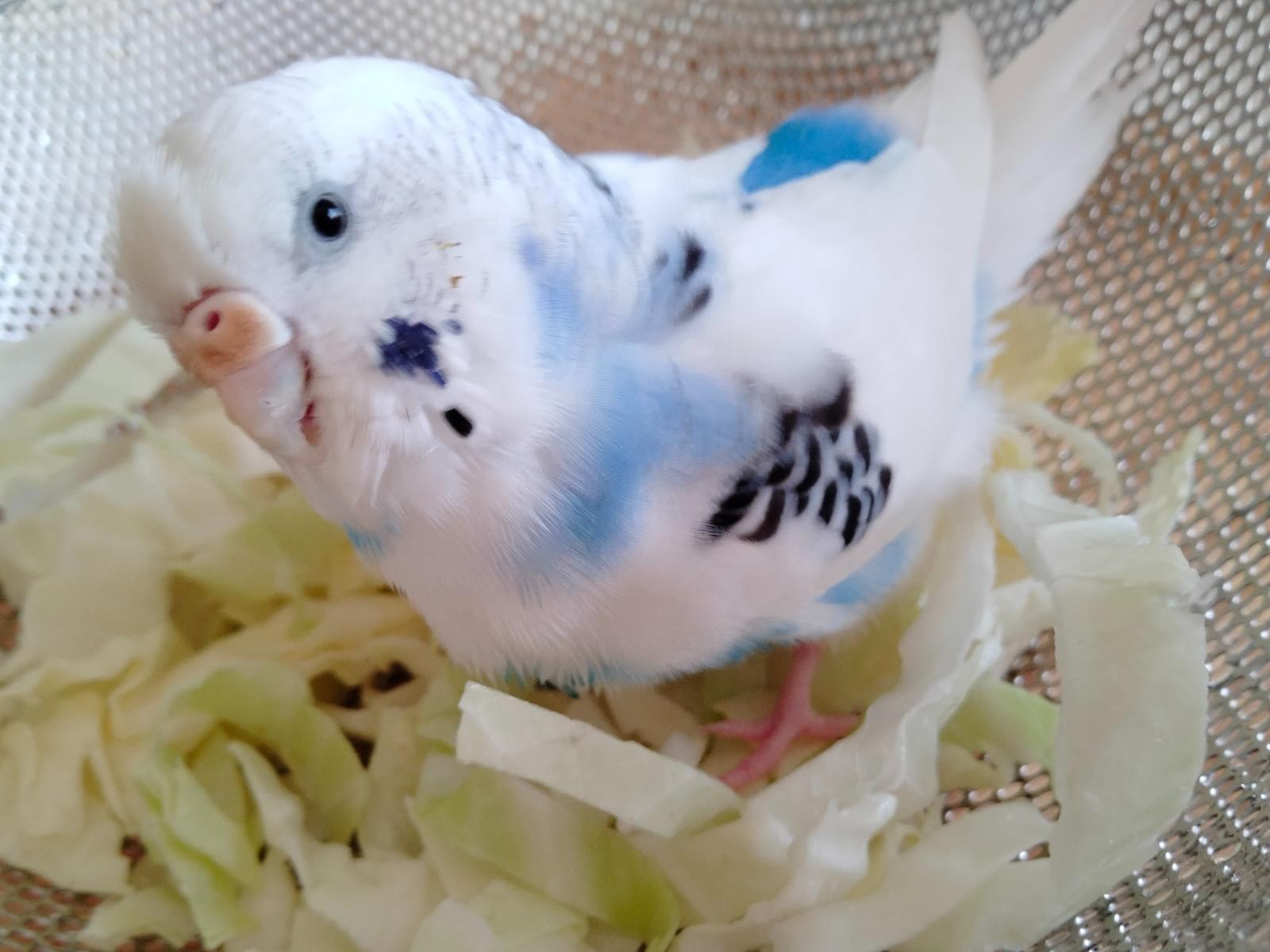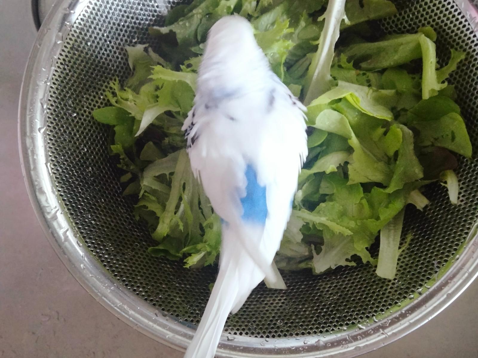ご飯は「ラウディブッシュ」のセキセイインコ用ペレットですが、ご褒美のシードやアーモンドは大喜びです。しその葉、ベビーリーフ、水菜やキャベツなど葉物も大好きです。