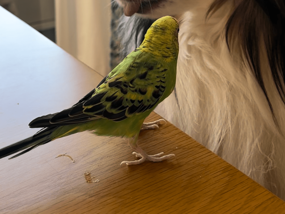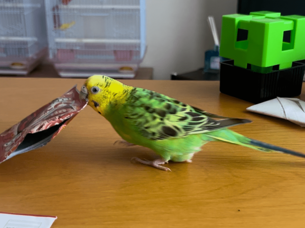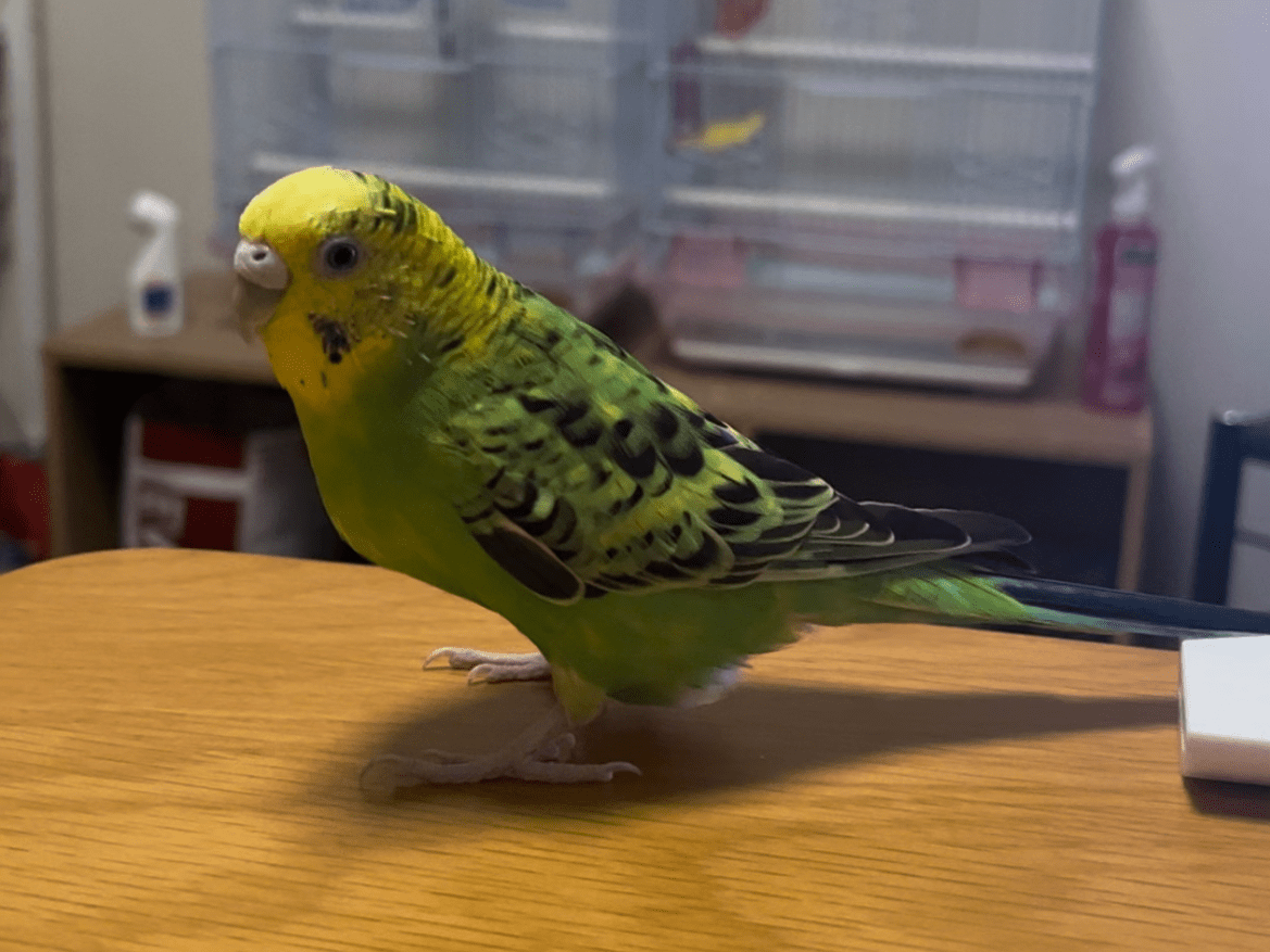 緑で、頭部分が黄色、あまりお喋りはしません。