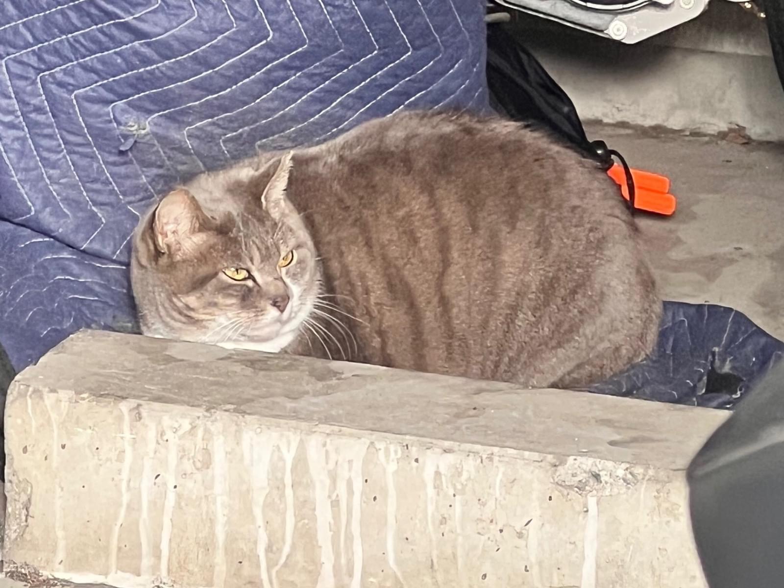 マンションの駐車場のところに、野良猫とは思えない綺麗な柄と見た目の猫ちゃんがうずくまって座っていました。
