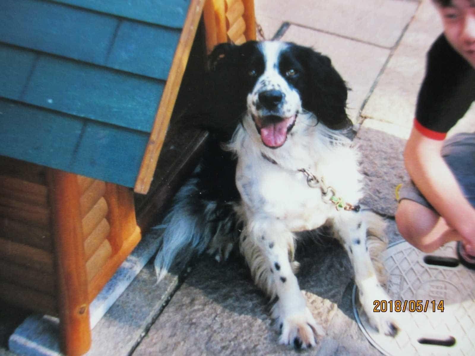 ・年齢:14歳 性別:オス 大きさ:中型(16キロ) 傷等:首に垂れ下がったイボと左胴体中央に大き目の脂肪の塊がある。断尾していない 毛色:白に黒ブチ 去勢済