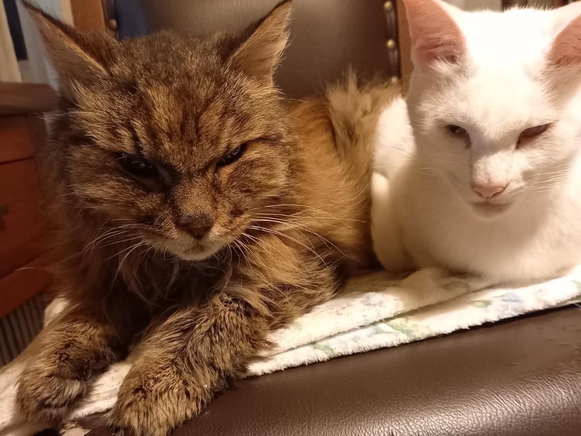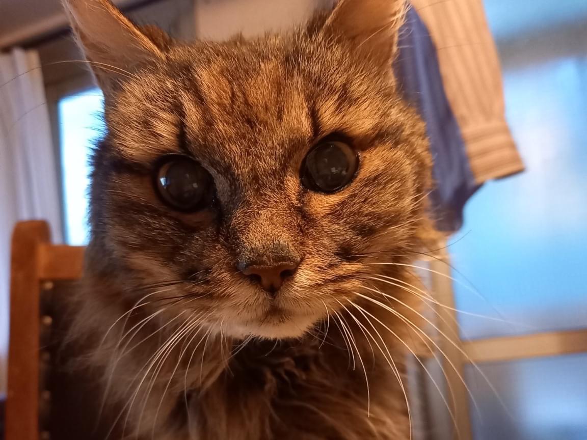特徴、茶色のノルエジァンフォレストキャット、警戒心強く、高齢の為歩くのがやっと。遠くから相手をじっと見つめてきます。
