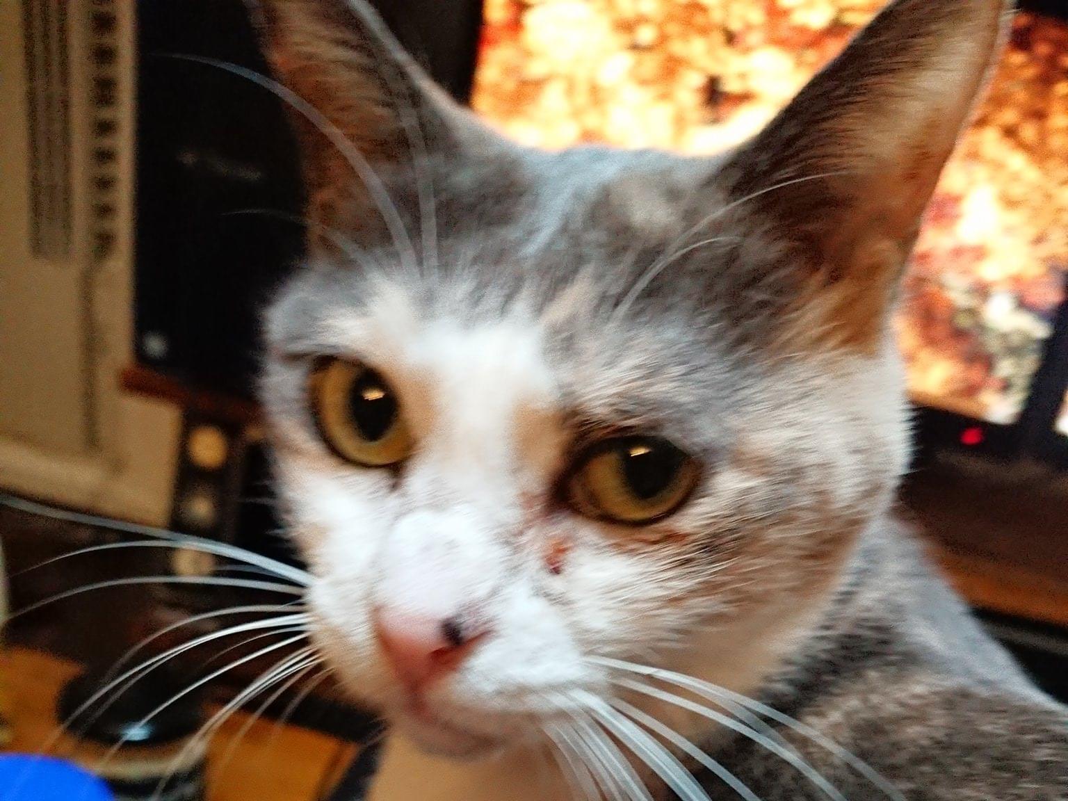 【特徴】 パステル三毛(グレー白うす茶)でしっぽは短い 目やにあります 首輪なし