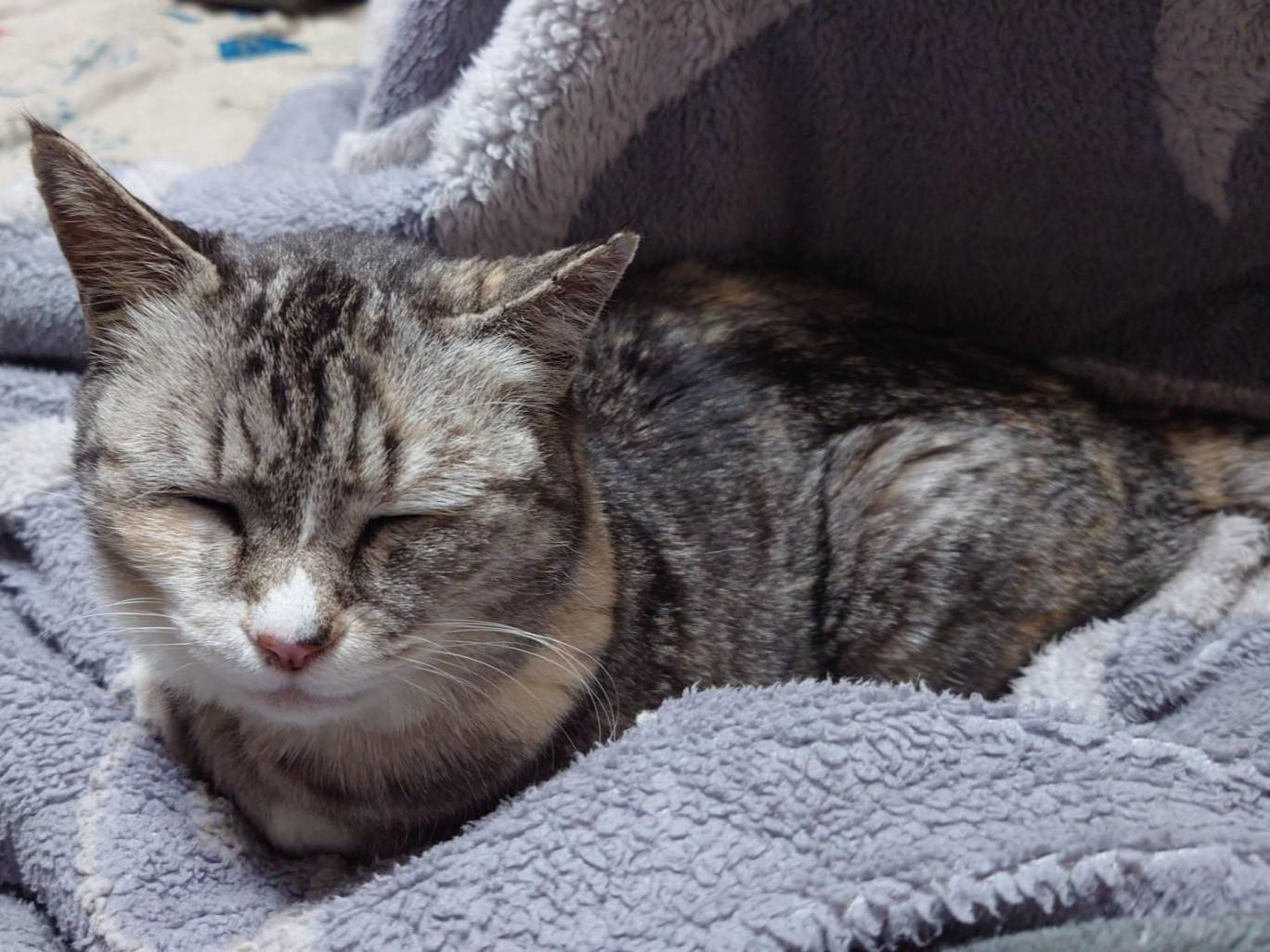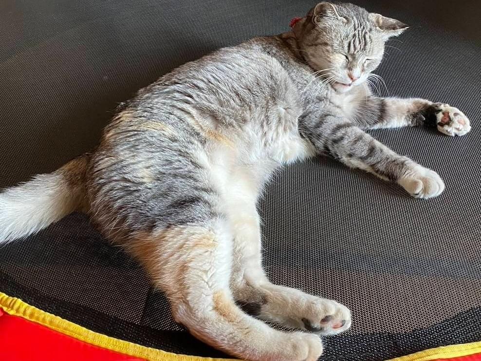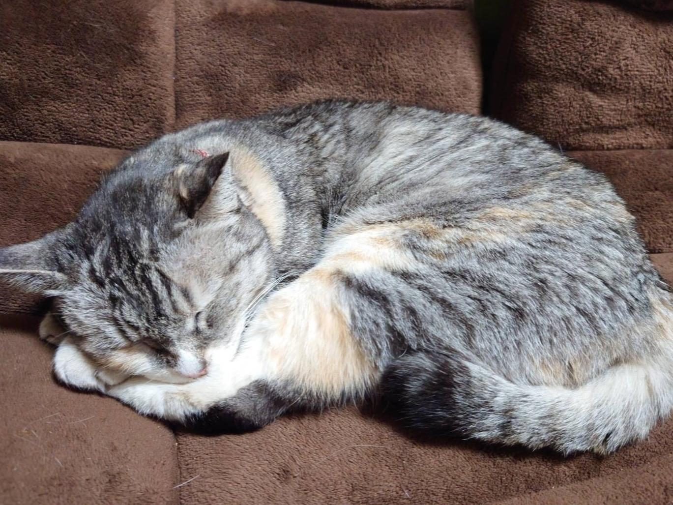 灰色の雑種で足の方は白くて茶色が混じっている子を探しています