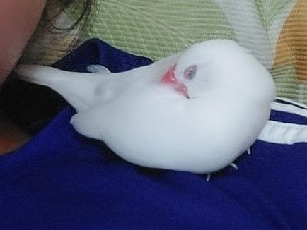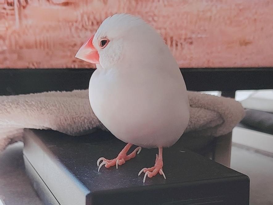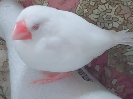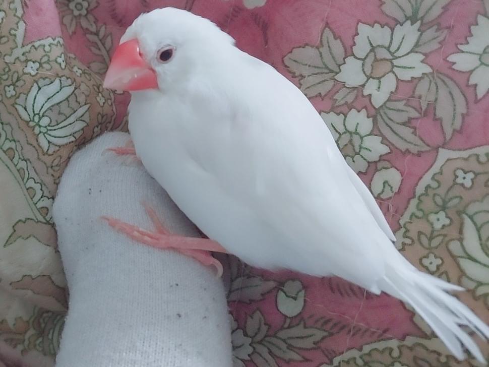 文鳥です。くちばし:ピンクで横が少しかけている。羽:白と羽の間が少しグレー。大きさ:手のひらにのるく