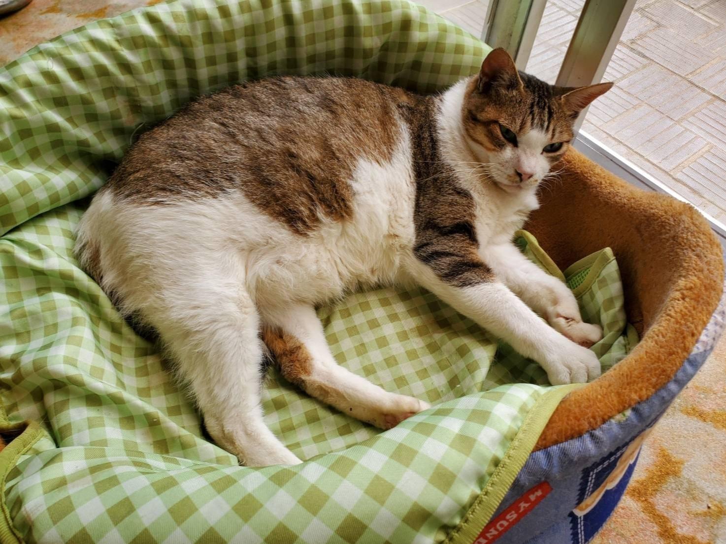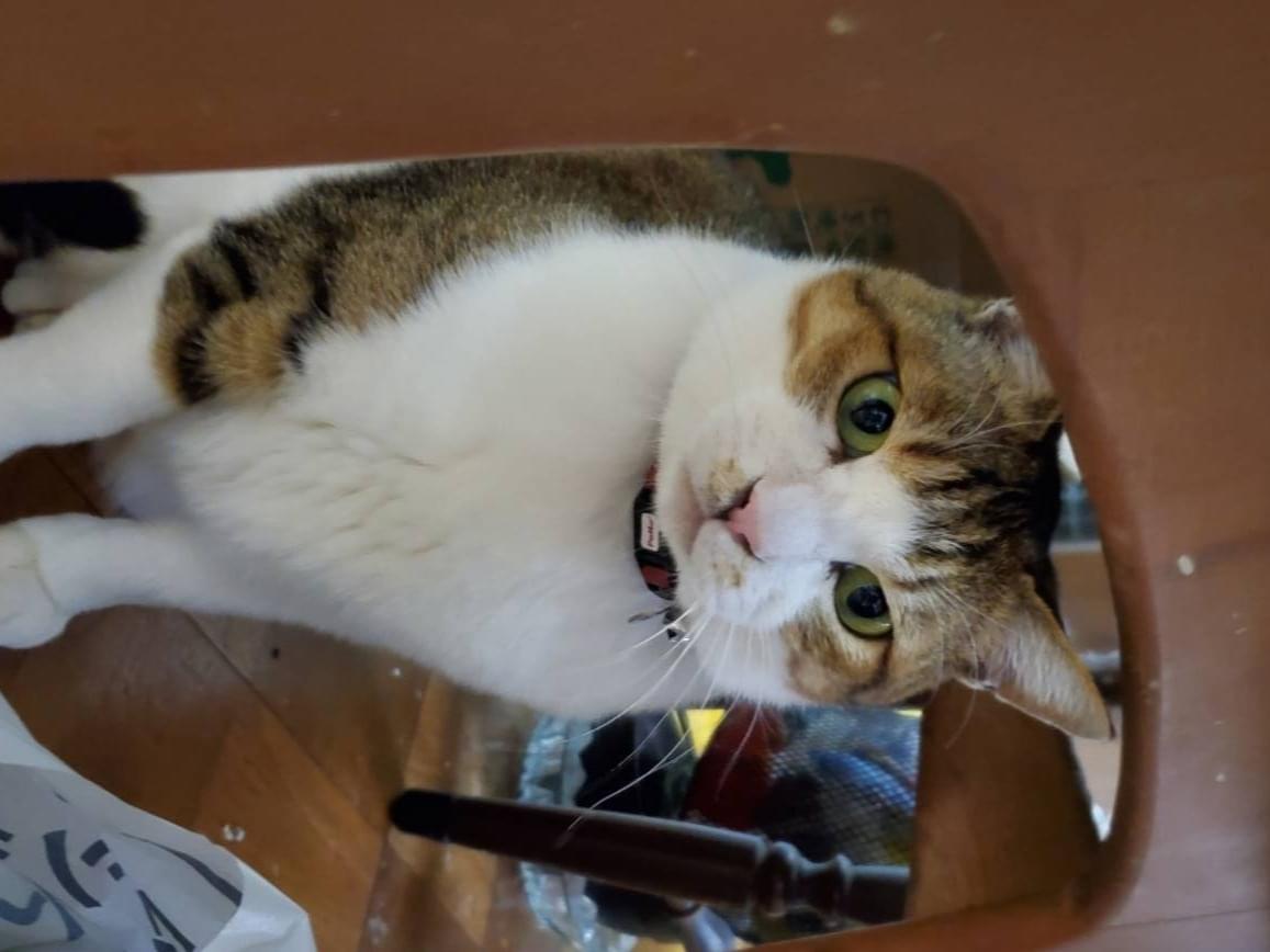 キジシロ、7キロ近くある大きな雄猫、瞳は黄緑、鼻の下にシミのような模様があります。慢性鼻炎なのでくしゃみをよくします。外れていなければ赤い首輪をしています。