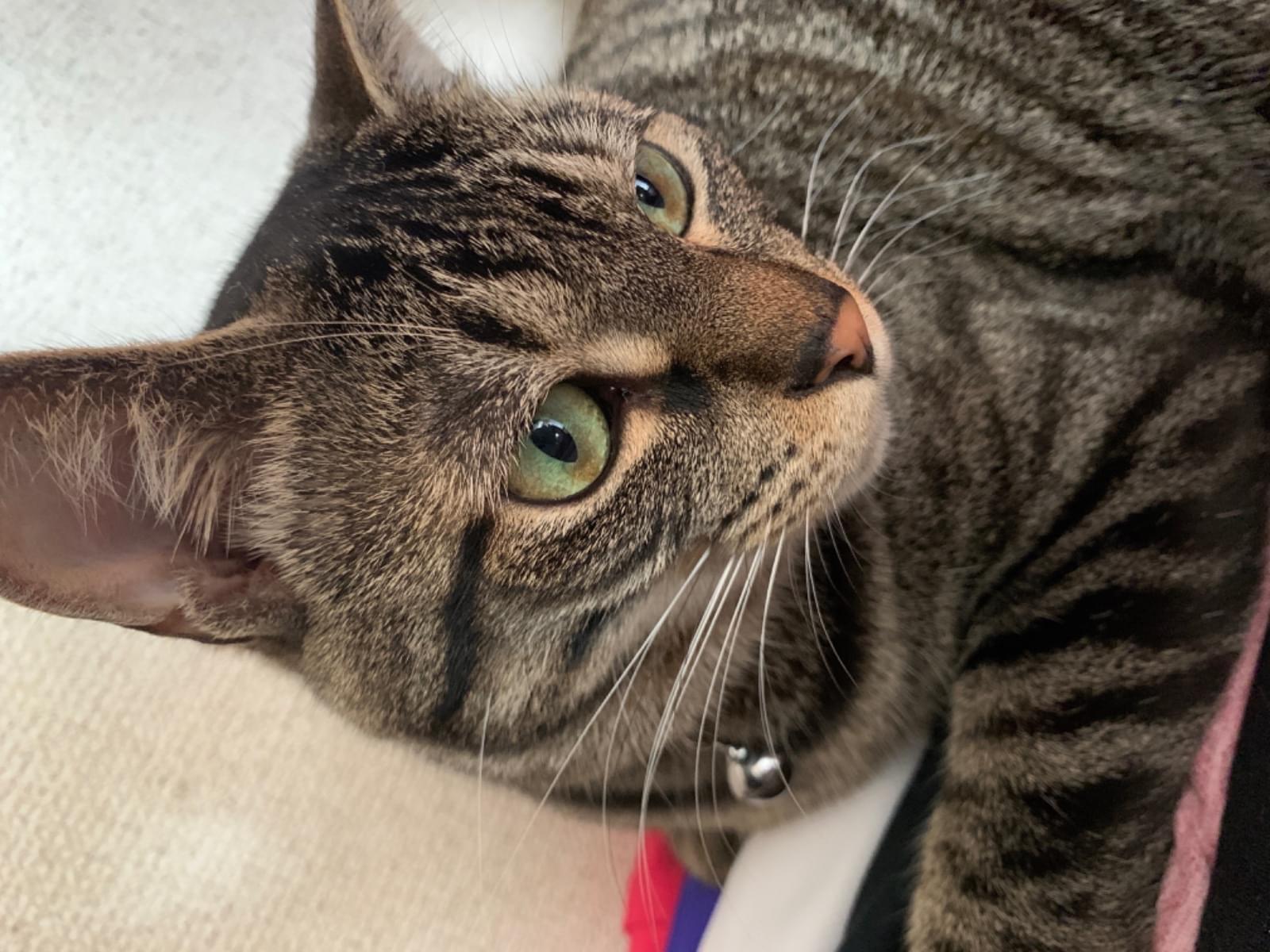 瞳は緑色。青いチェック柄の首輪(鈴付)。
