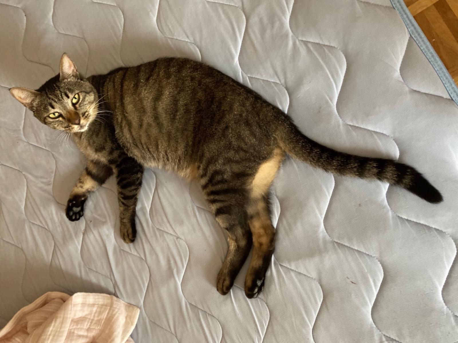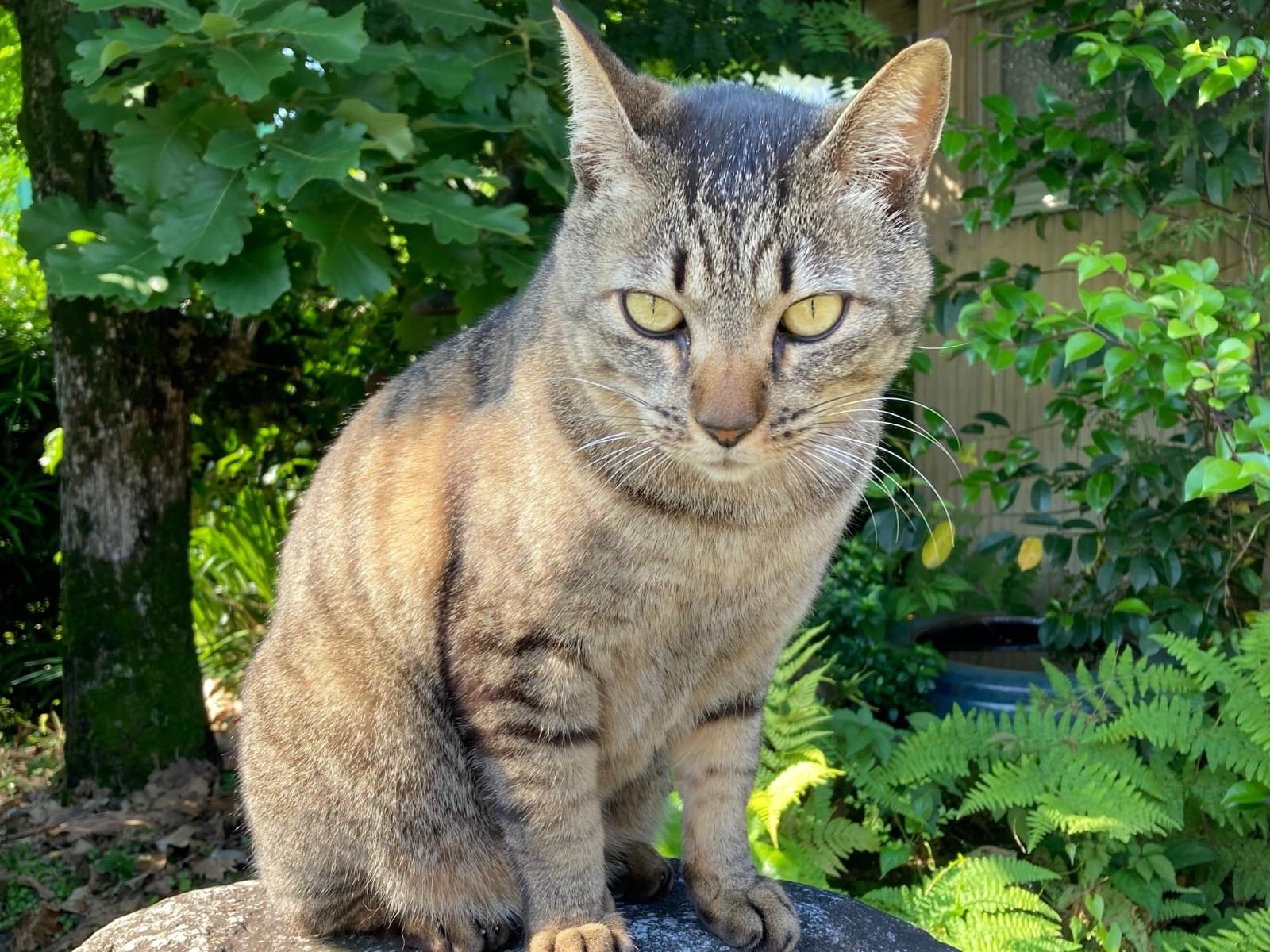 中型のキジトラのオス猫で去勢済みです。瞳の色はイエローです。