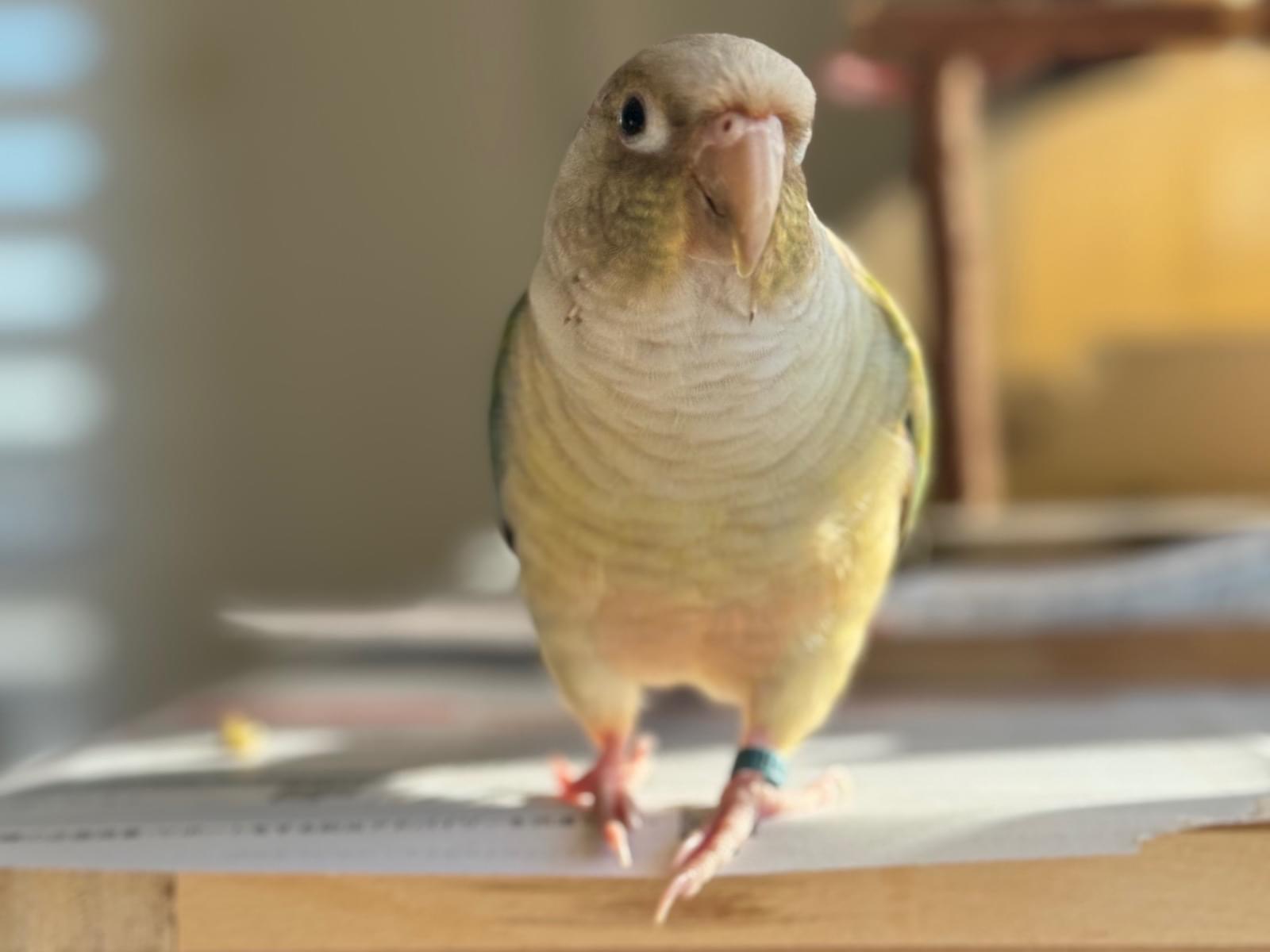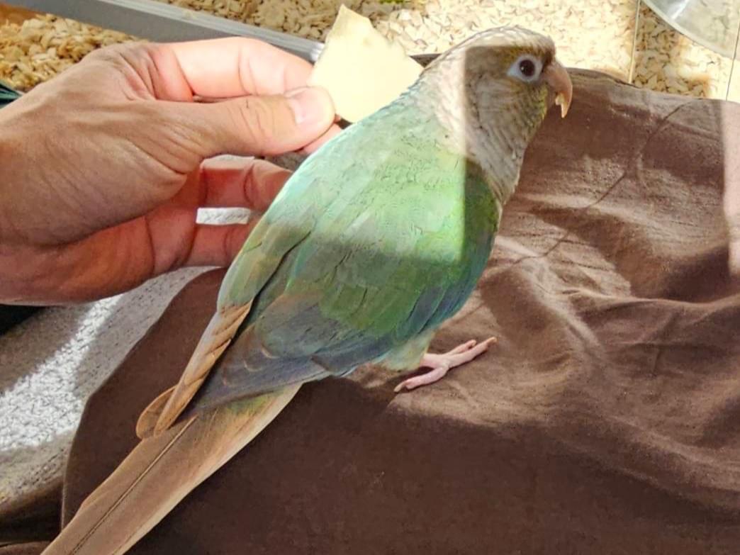 お腹が薄い黄色、背中の羽の部分が深緑(角度によっては青や紫が少し入っています)のウロコインコを探しています。左脚に青い足環が付いています。