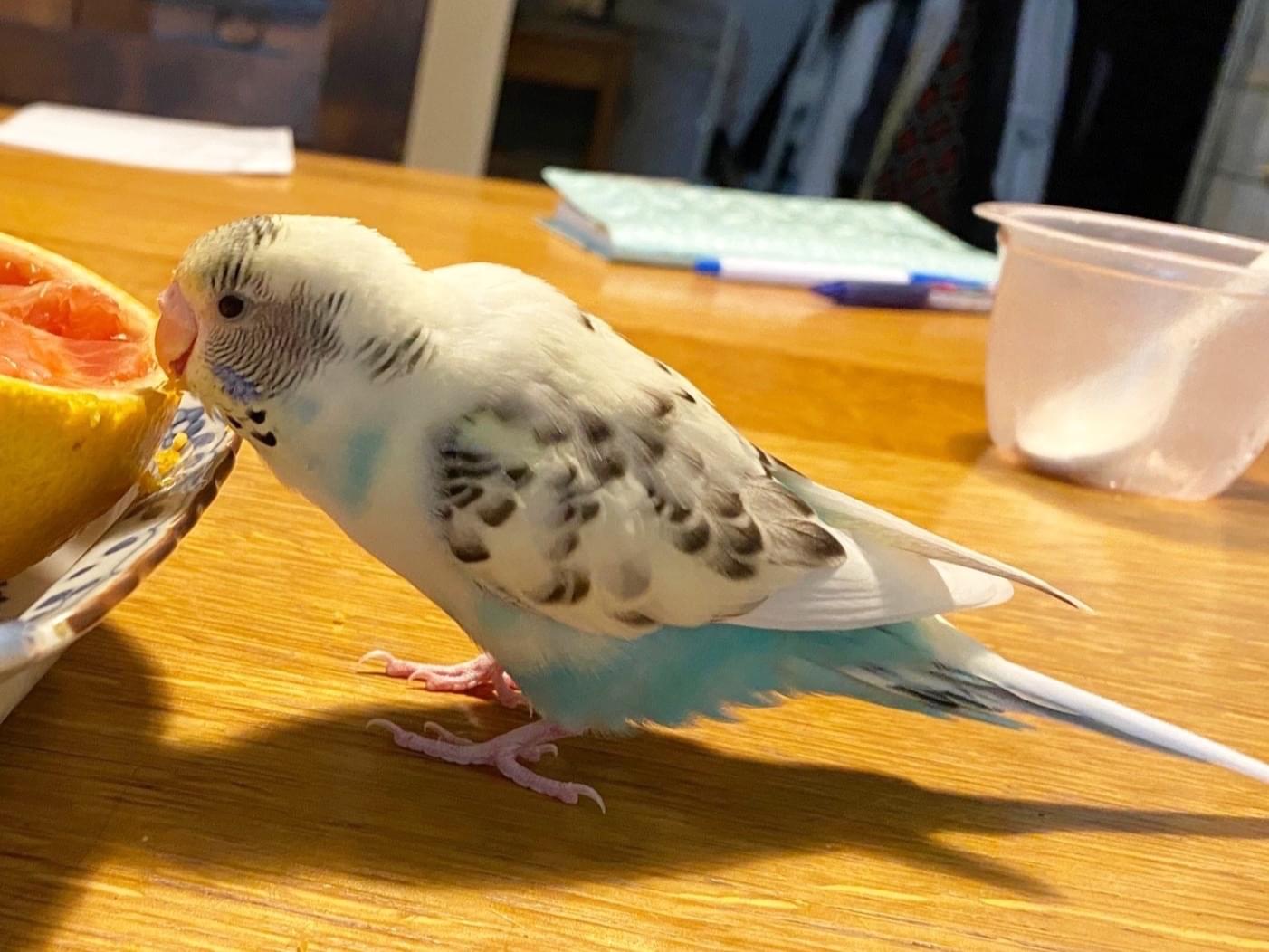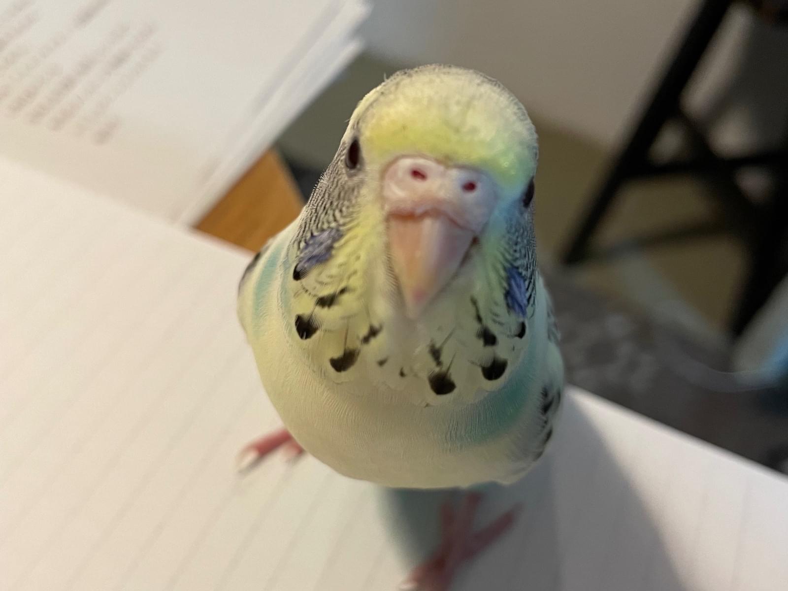 黄色の部分がやや薄めで、「ピヨピヨ」って鳴いたりします。鼻の先が少しめくれています。