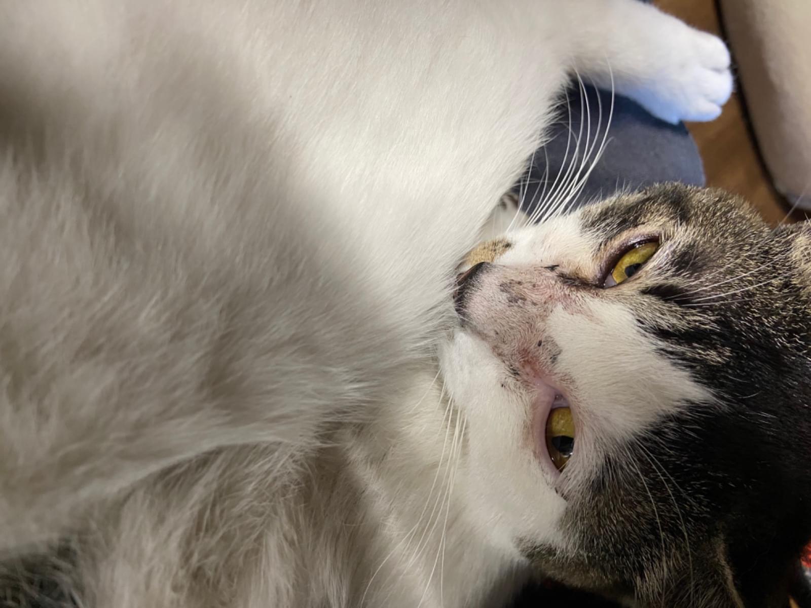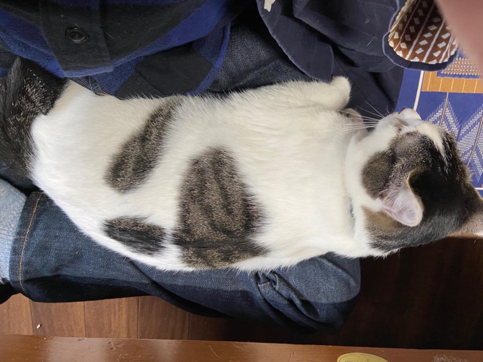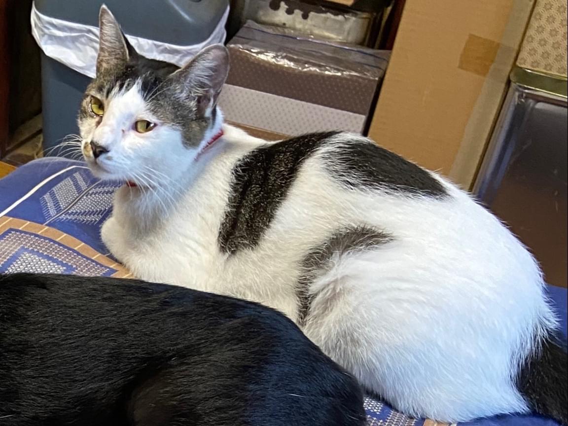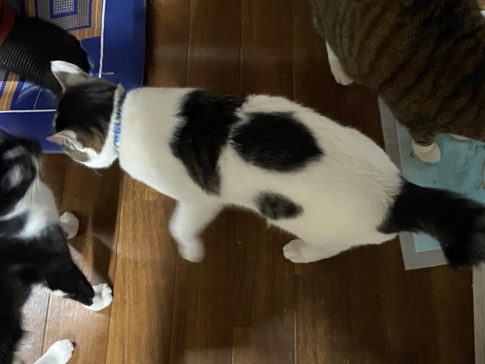 白と黒のホルスタインガラです。人懐っこく、4キロ弱の去勢済のオスです。