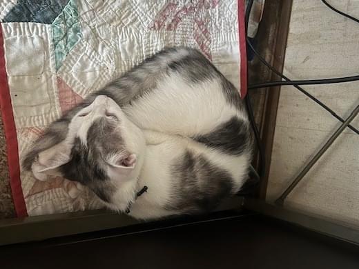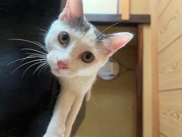 白地に灰(黒)の斑点があり、尻尾は白灰の縞模様です。