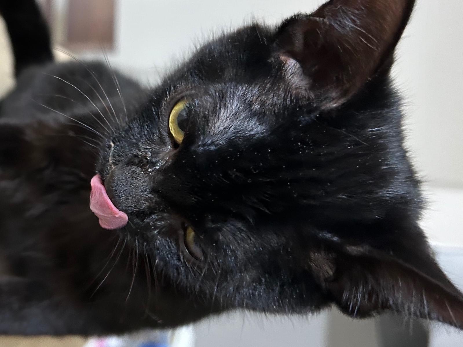 黒猫、生後4〜6ヶ月、声はかすれた声でかなり人懐こい子です。首輪はついてませんでした。保護時風邪を引いていて病院に受診し、白血病等の検査しましたがいずれも陰性でした。去勢はまだしてませんでした。