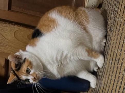 お腹側が白色が多く、頭部は茶色と黒色が半分ずつになっているのが特徴です。いまは少し痩せているかもしれませんが、元々はドッシリとした体格です。