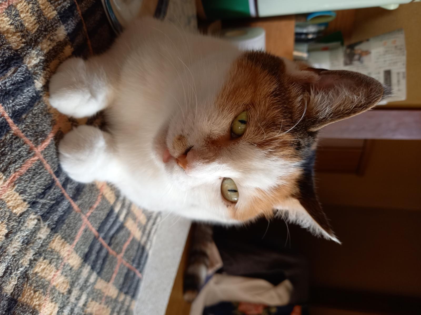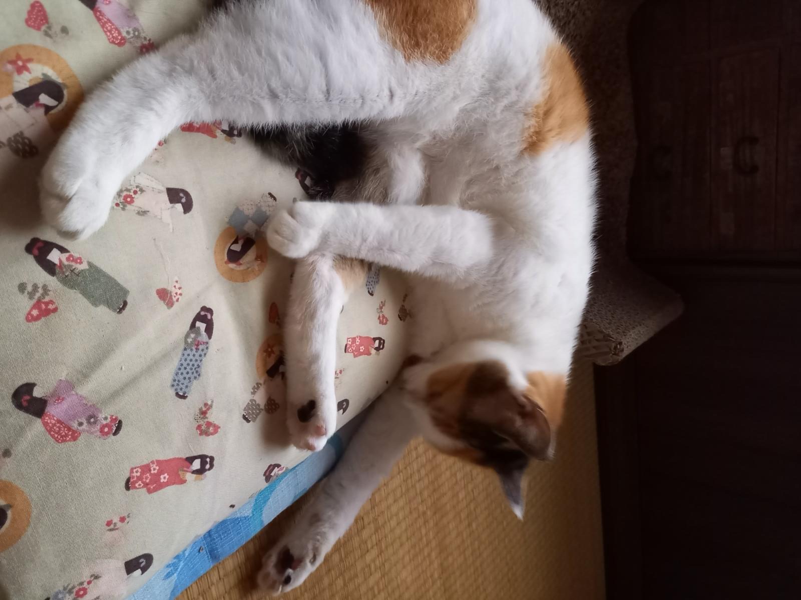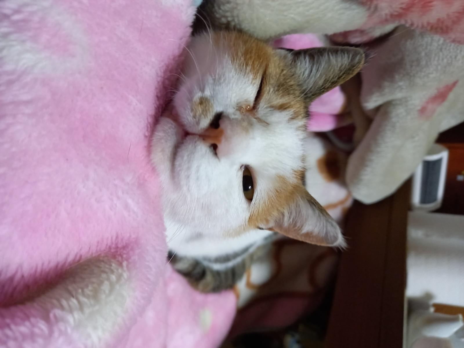風邪を引いていると思われ目から赤い涙が出ています。首輪は無し。震災で怯えています。歯がありません。