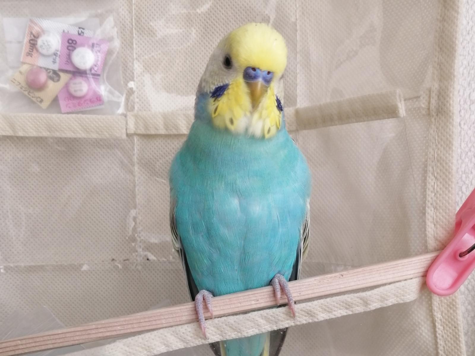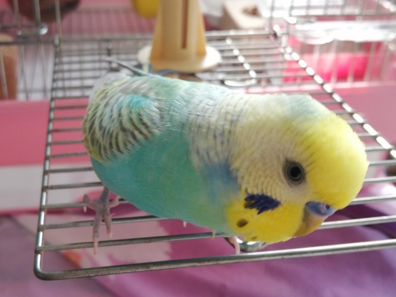体は水色、頭が黄色、鼻が青いセキセインコです。自分の名前「トムちゃん」や「あっち向いてホイ」「あけおめ」をよく喋ります。