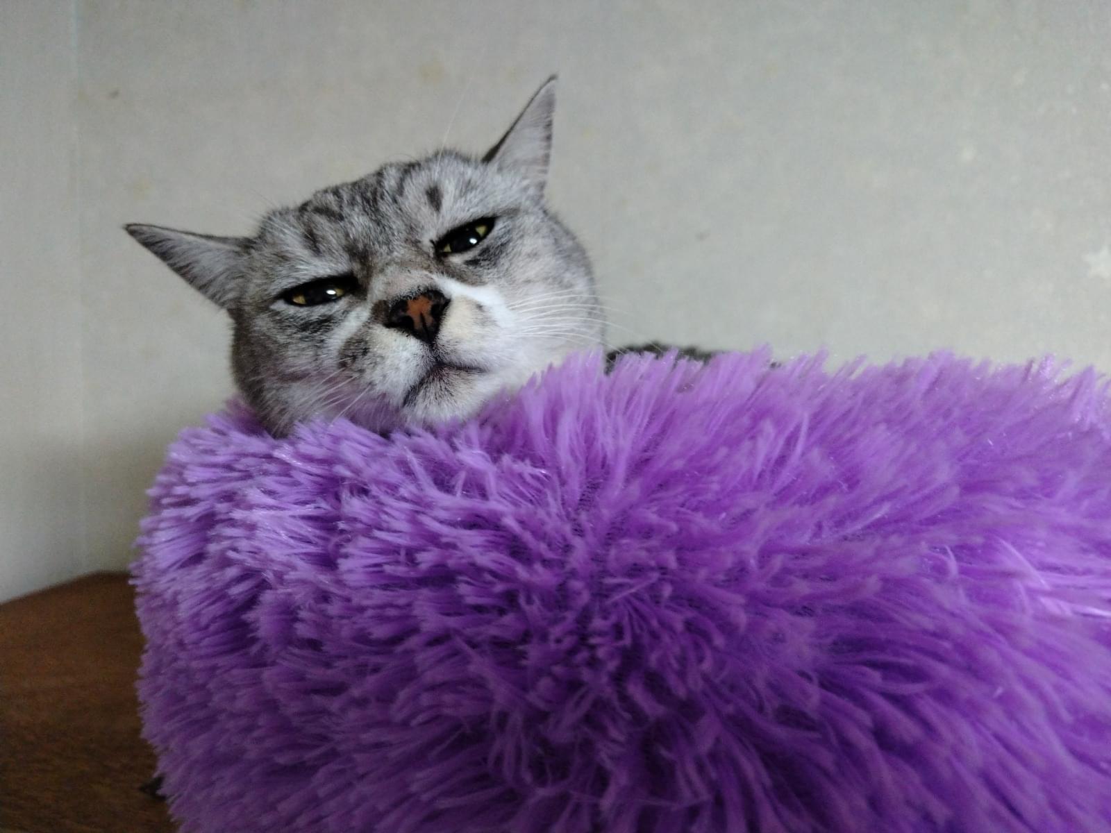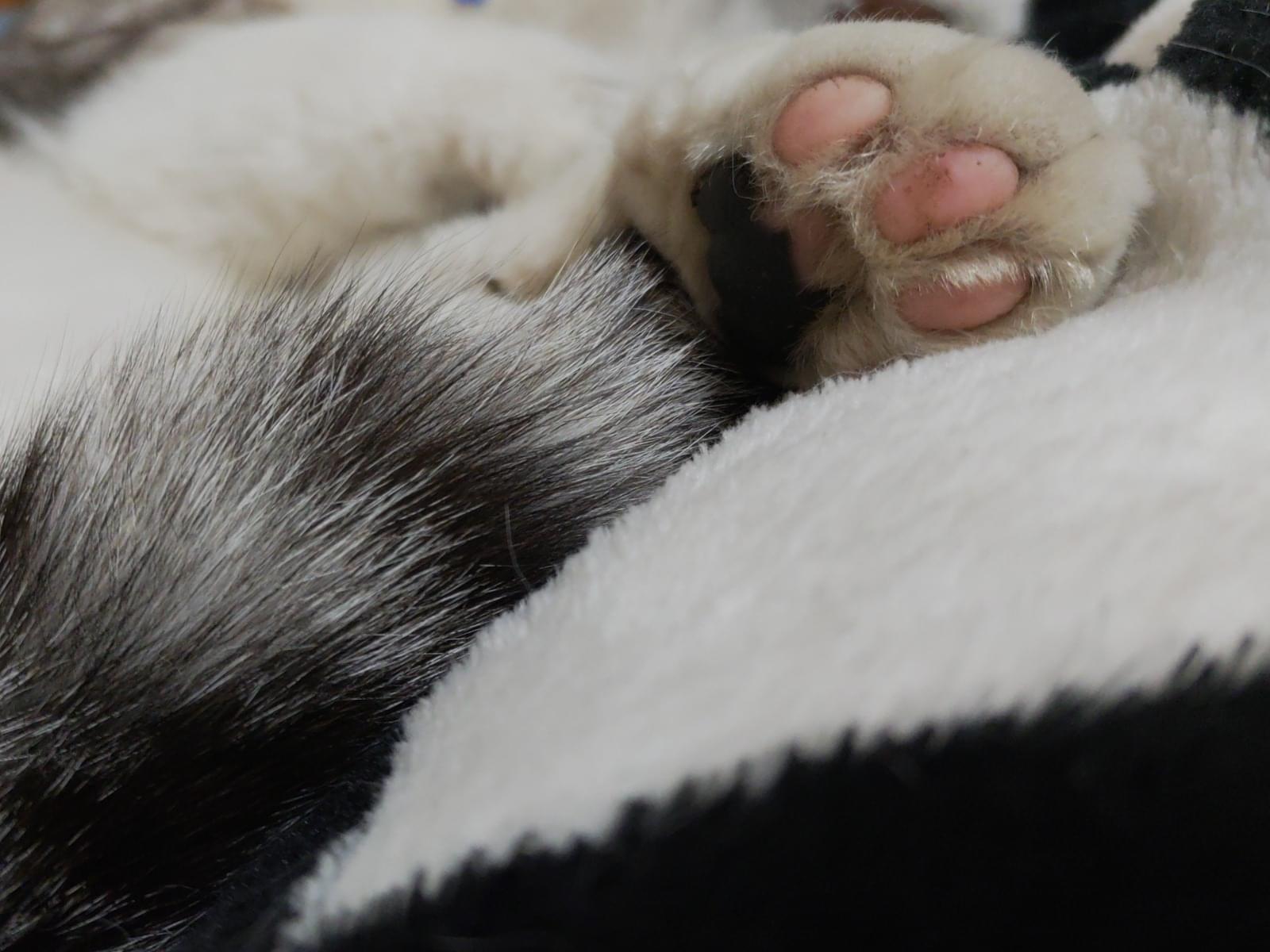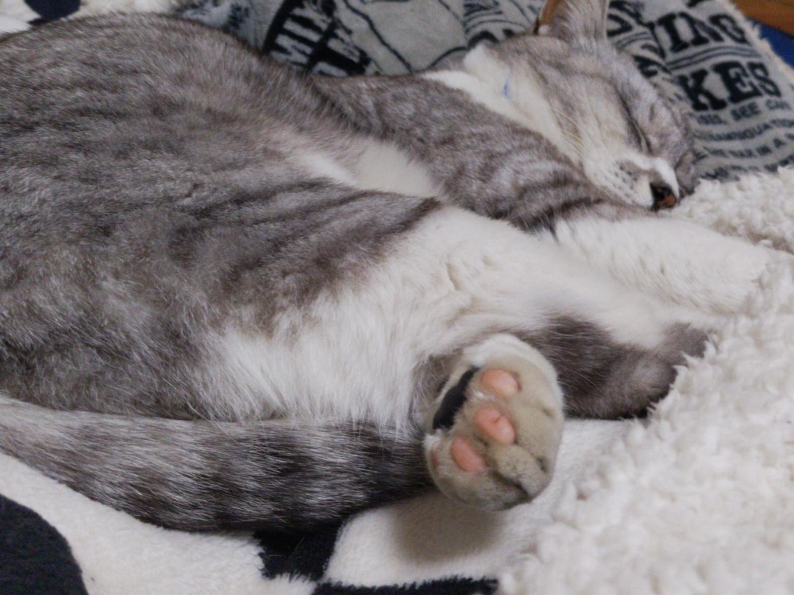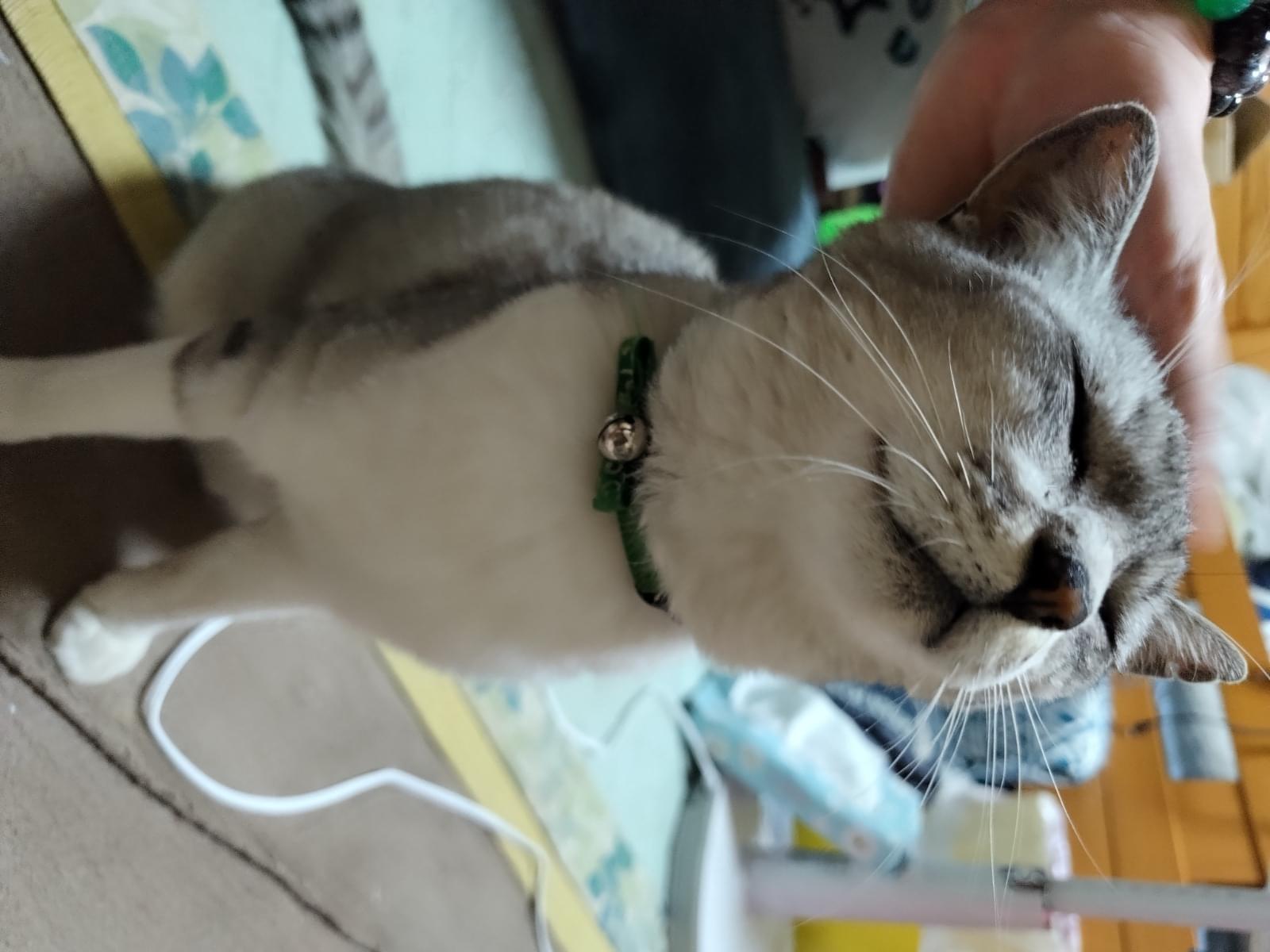 首輪は紫色に白の肉球柄の物を付けていましたが、外れているかも知れません。