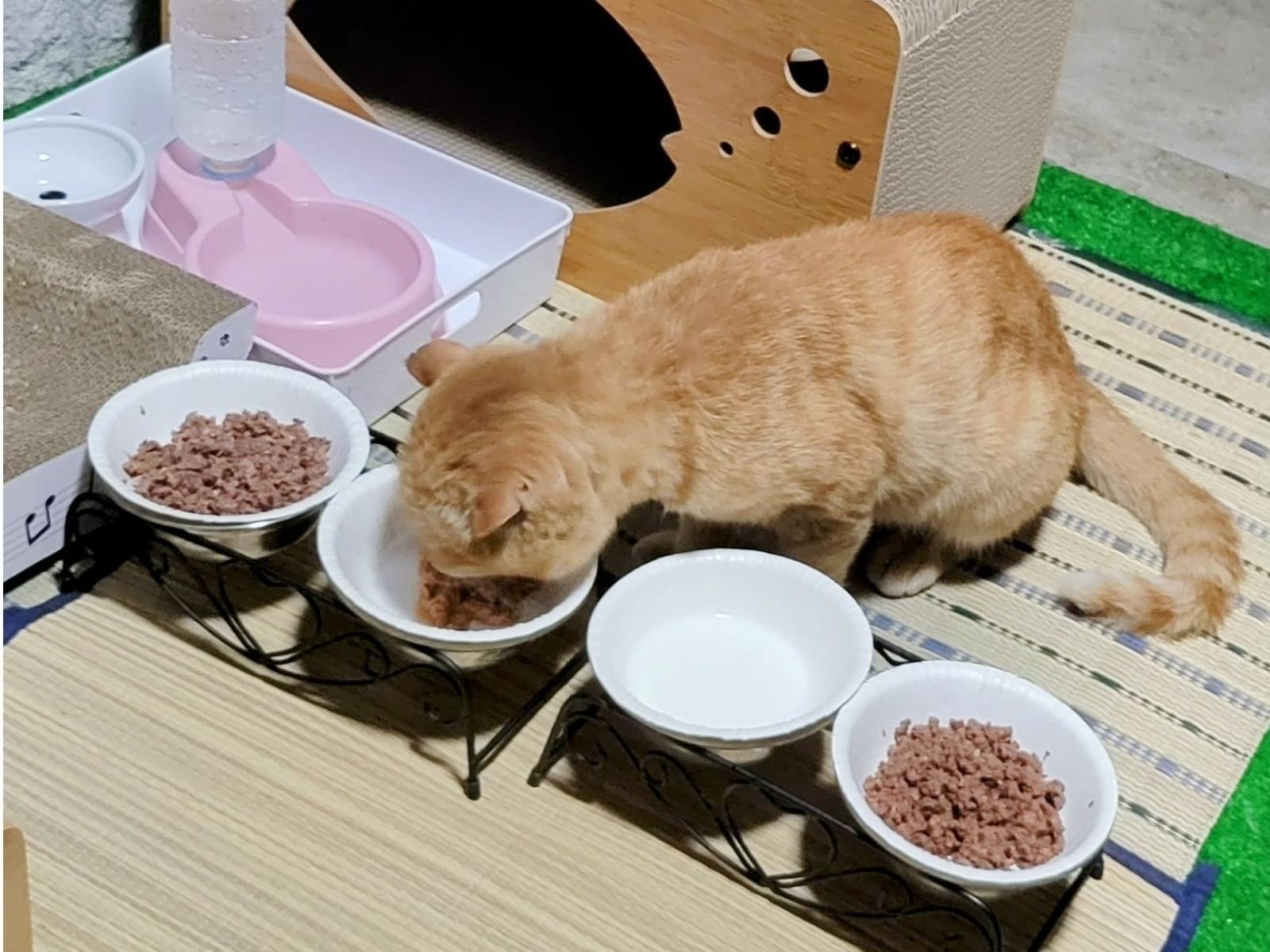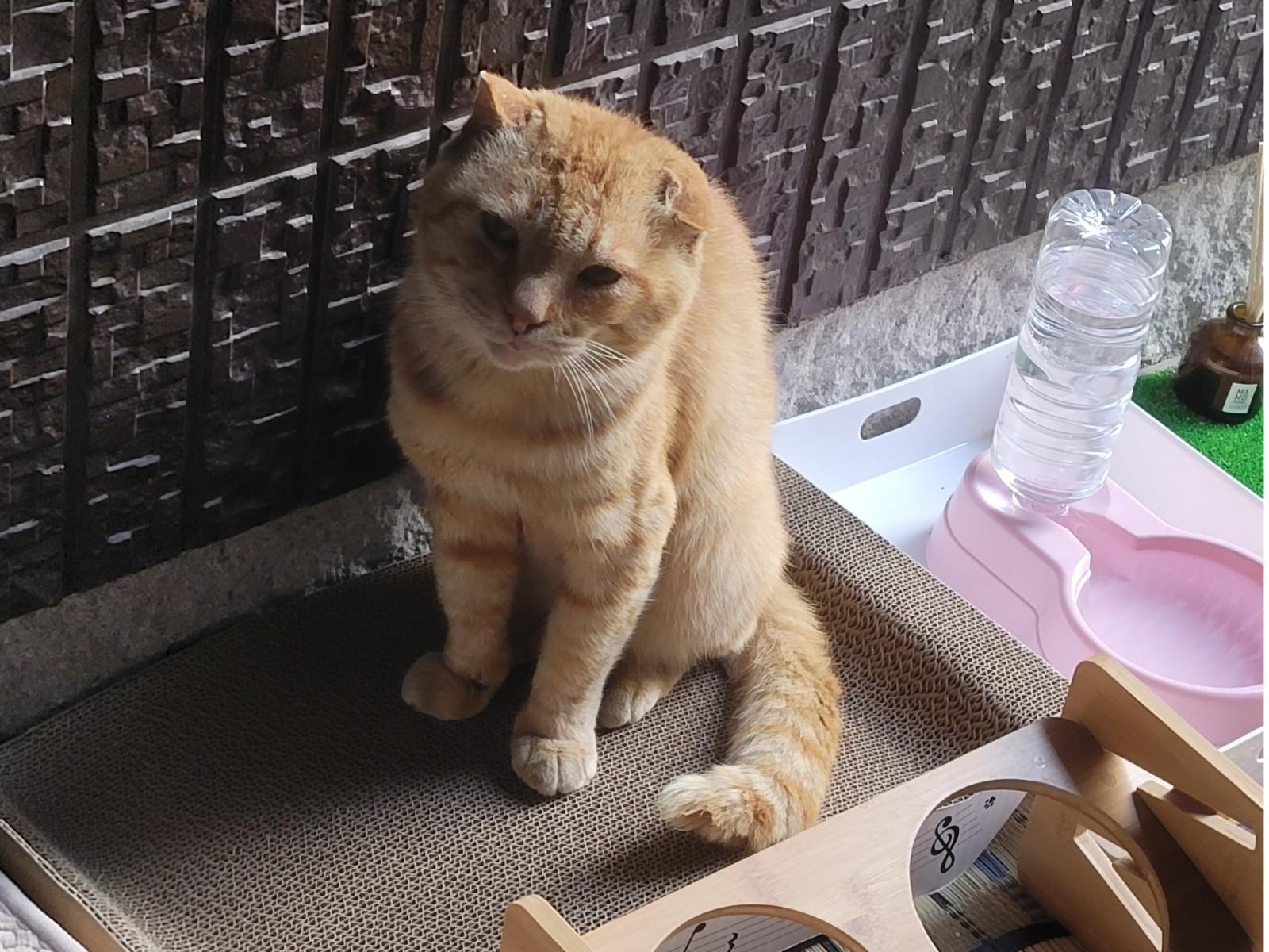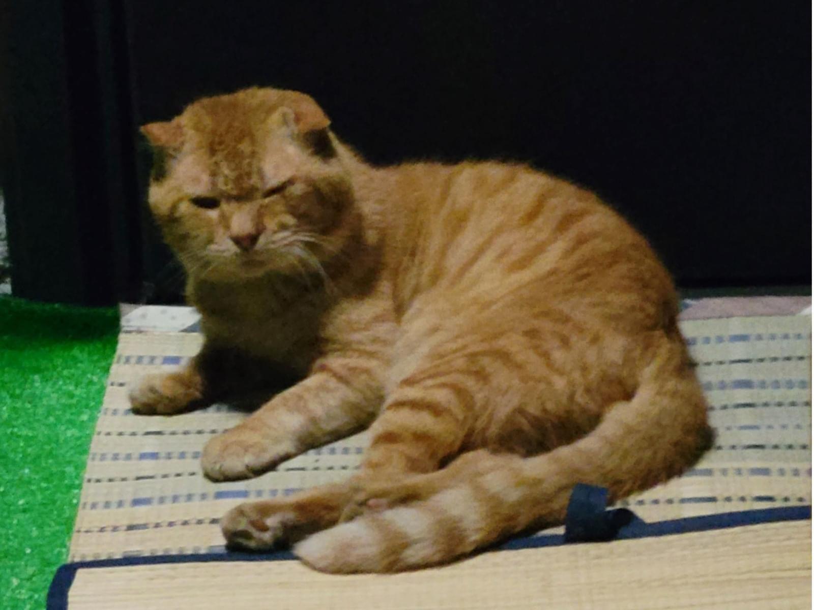 耳が小さく、左耳が垂れている茶トラの猫です。