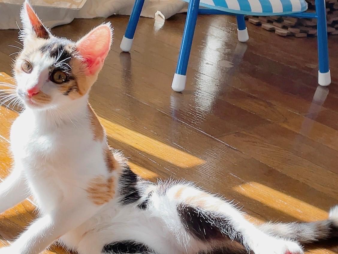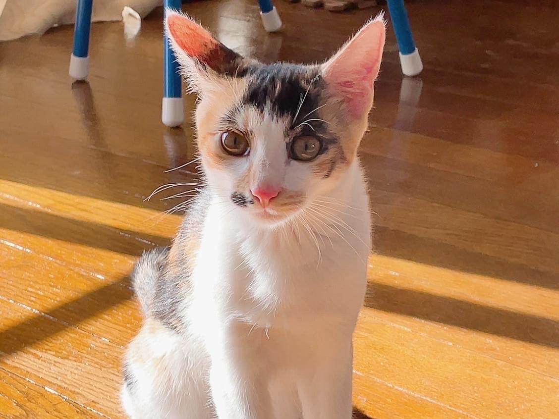 口元に黒いブチがある鍵尻尾の三毛猫です
