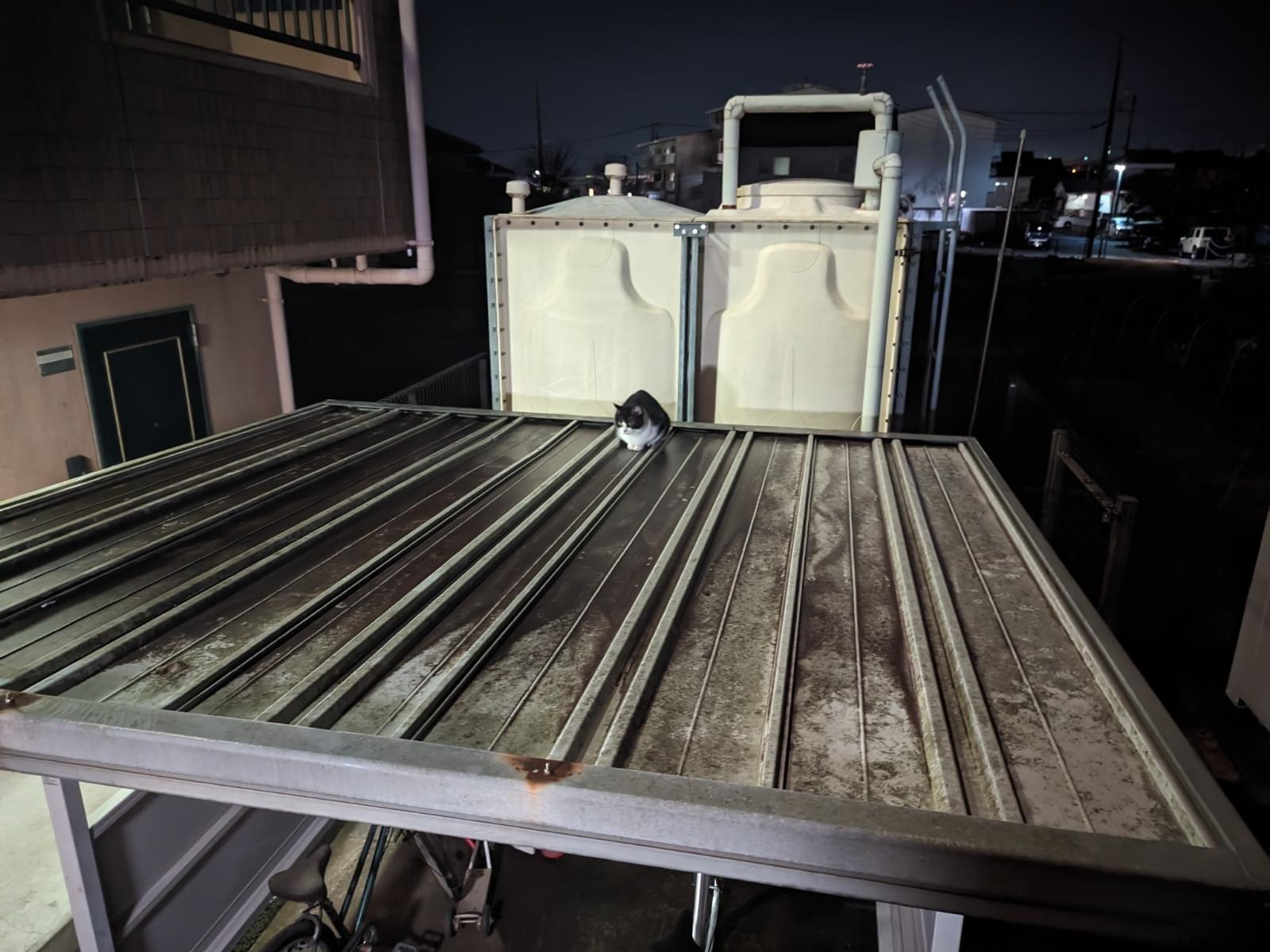 迷い猫が賃貸住宅の自転車置場の屋根にいます。
