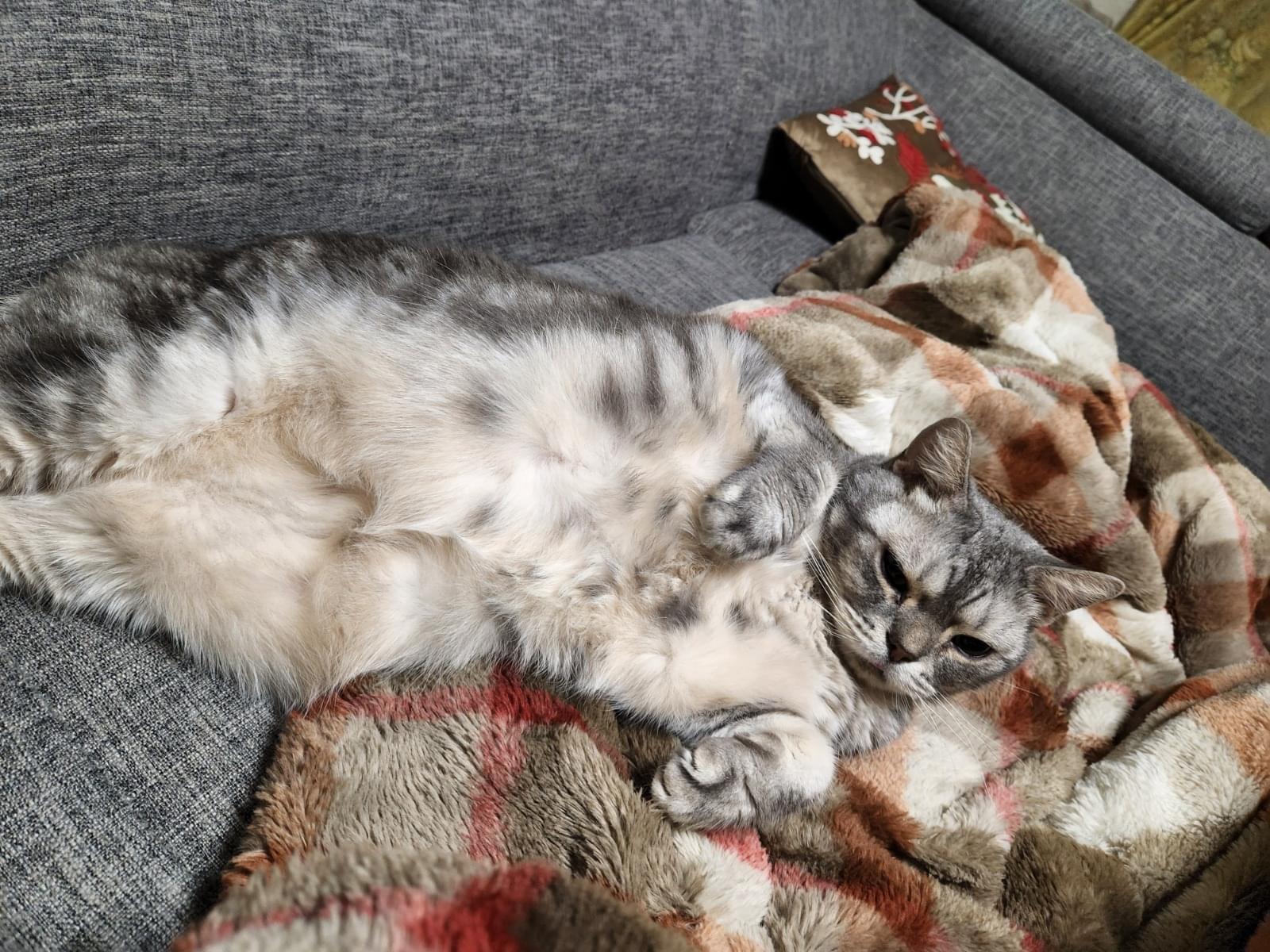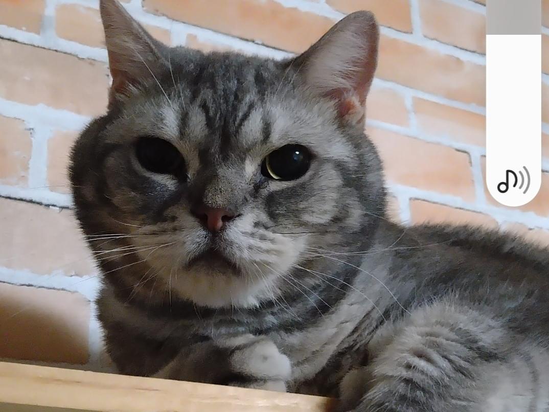 太っているグレーのアメショーでお腹がブヨブヨしています。おっとりした性格でとても人懐っこく、甘え上手な猫です。