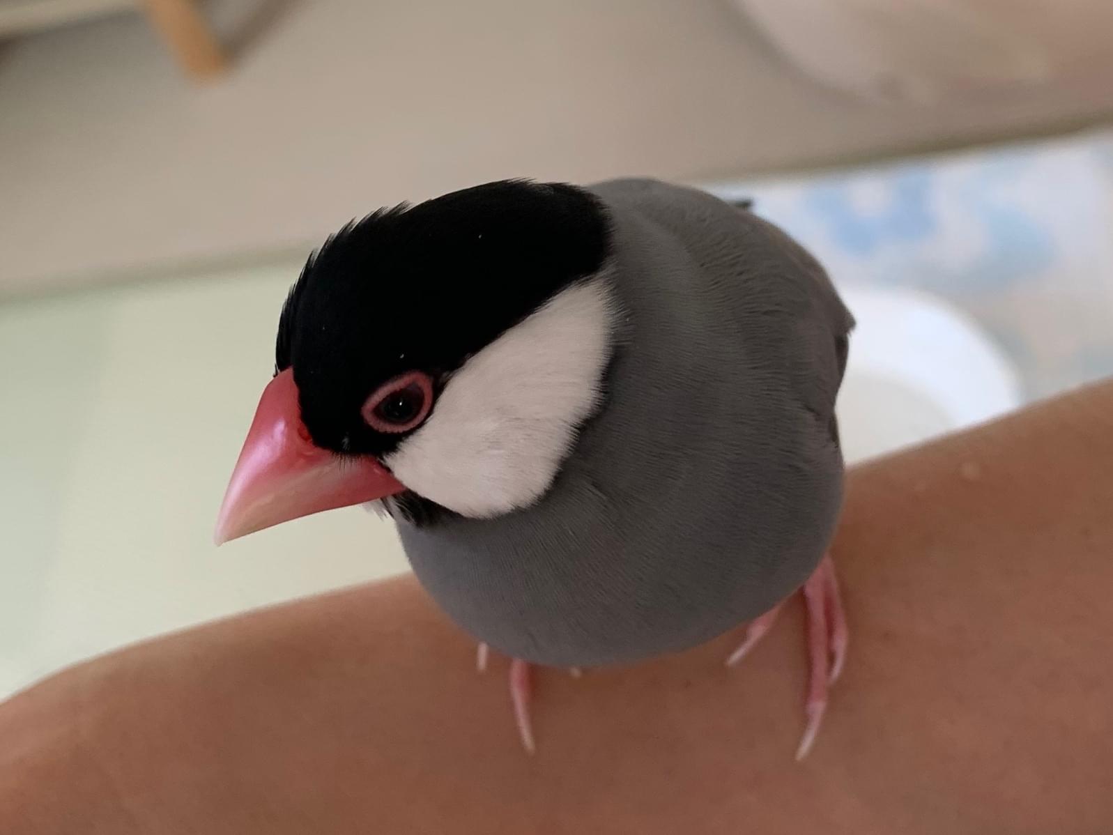 人懐こくて、手を差し出すと素直に乗ってきます。また好奇心旺盛で、作業をしていると肩や頭、手に乗ってきます。