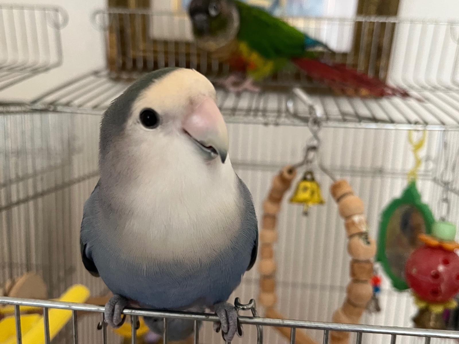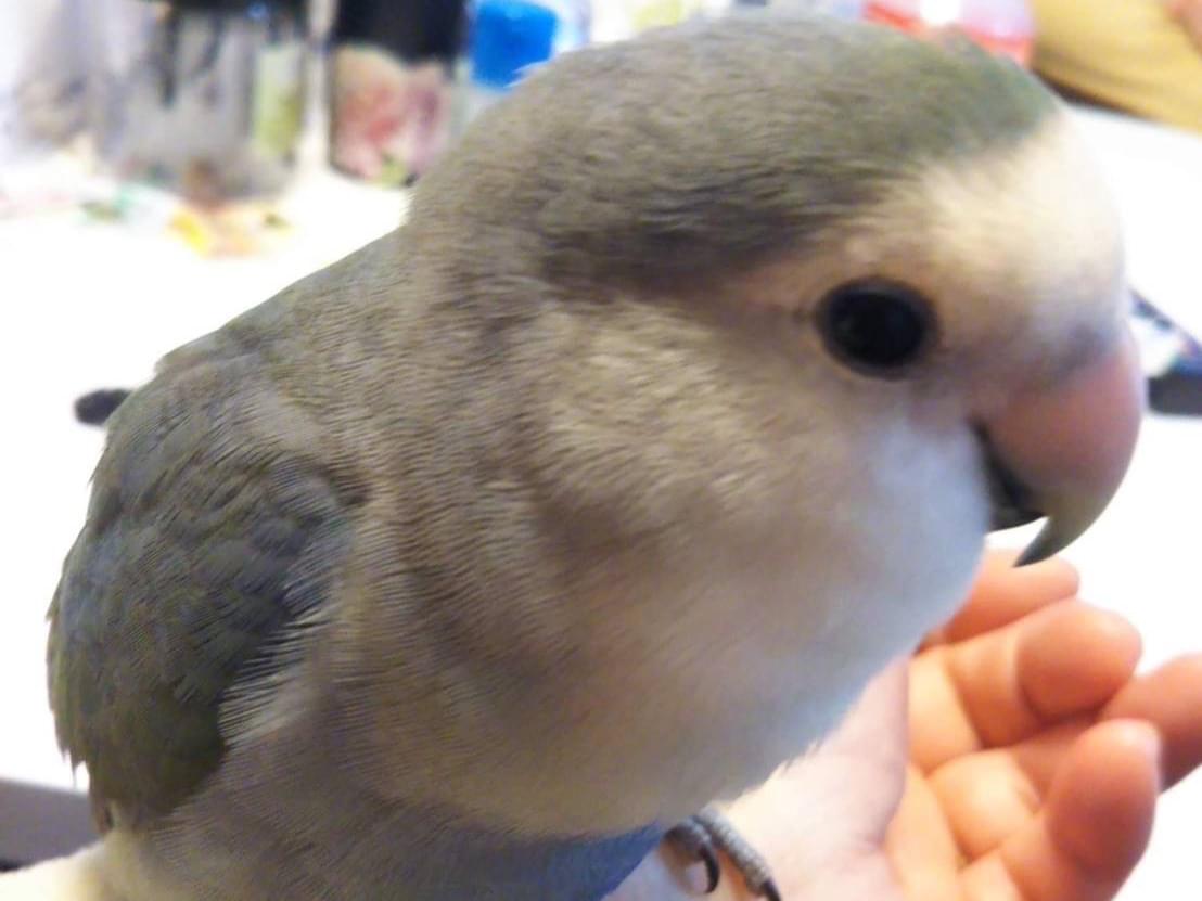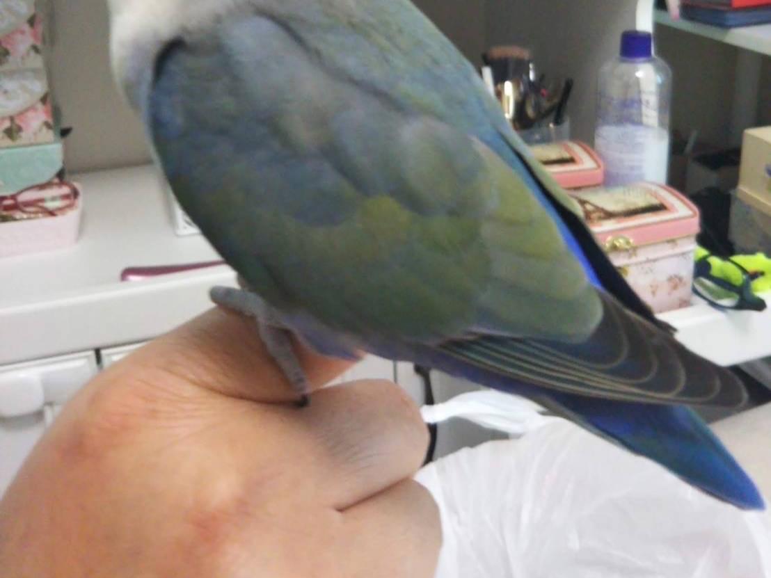 頭はグレーベースで体の色はくすみブルーのベースにくすんだ緑の色が所々入っています。体長は10cm程で丸みのある体です。甘えん坊で、よく手の中に包み込まれる事が好きな子です。放鳥して肩に乗っているときに窓を開けてしまい飛び立ってしまいました。