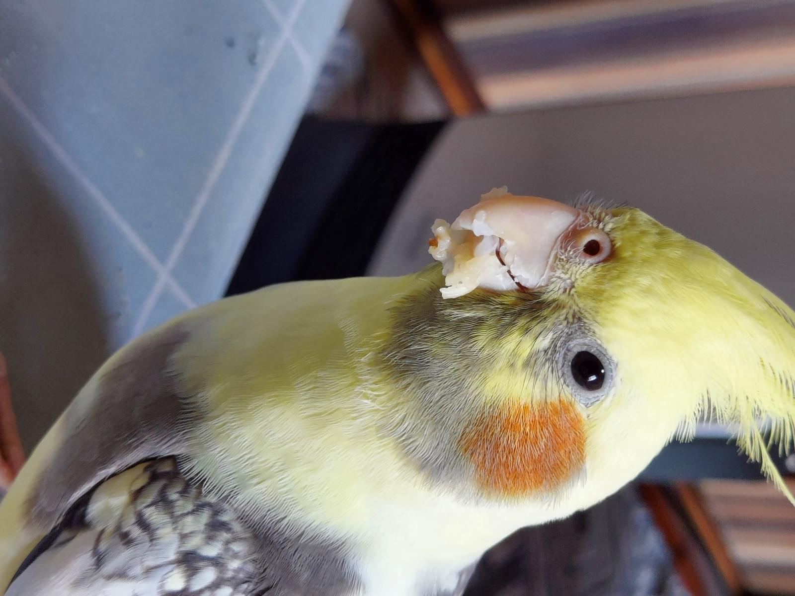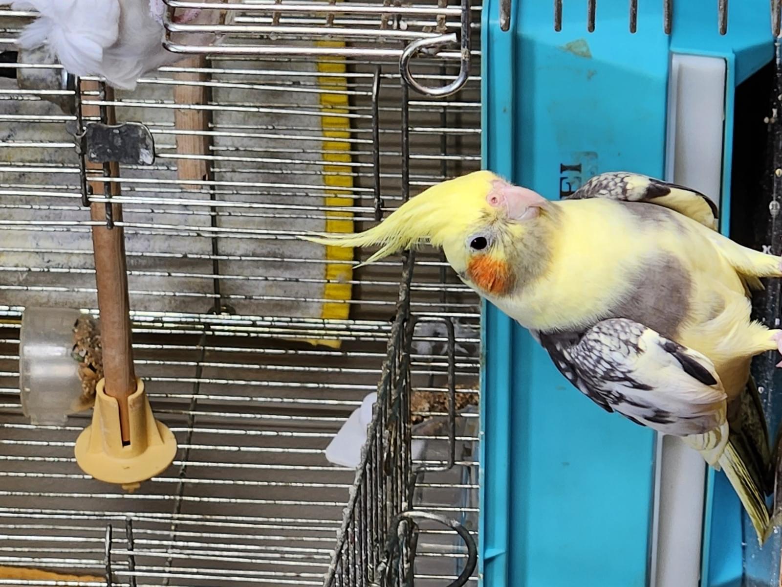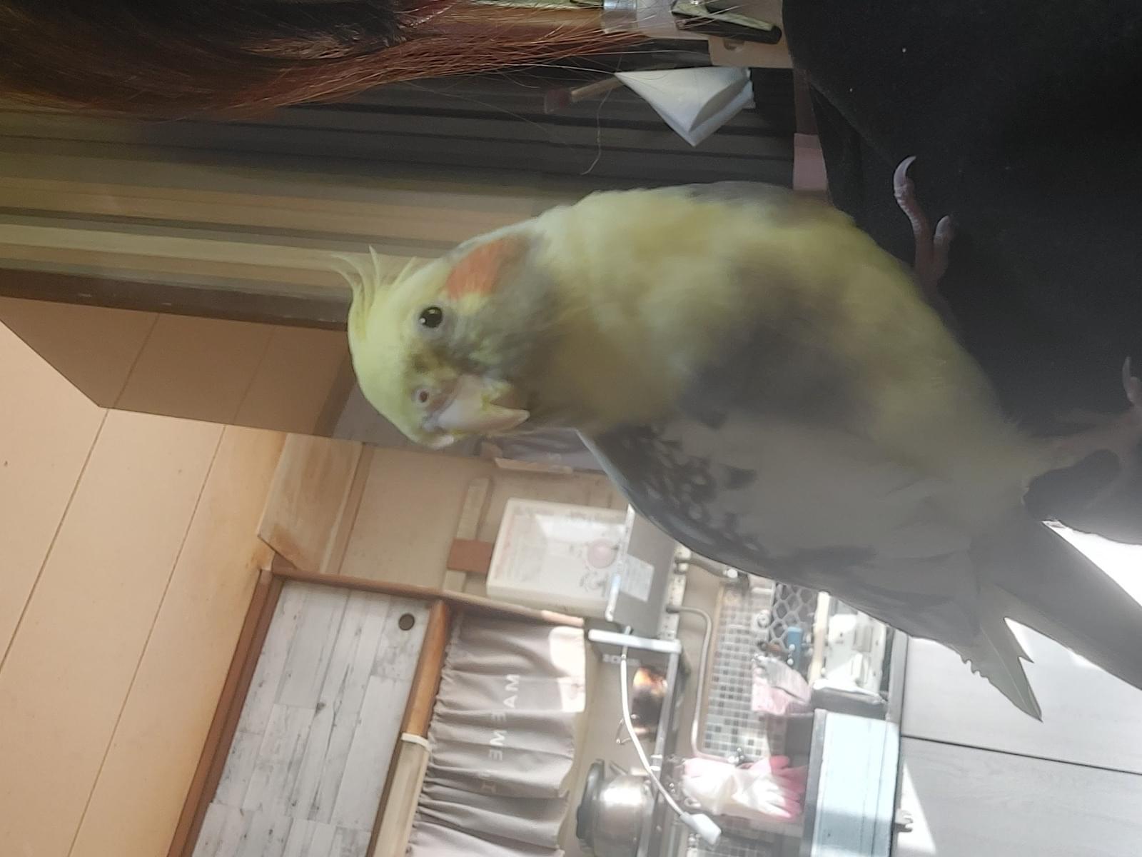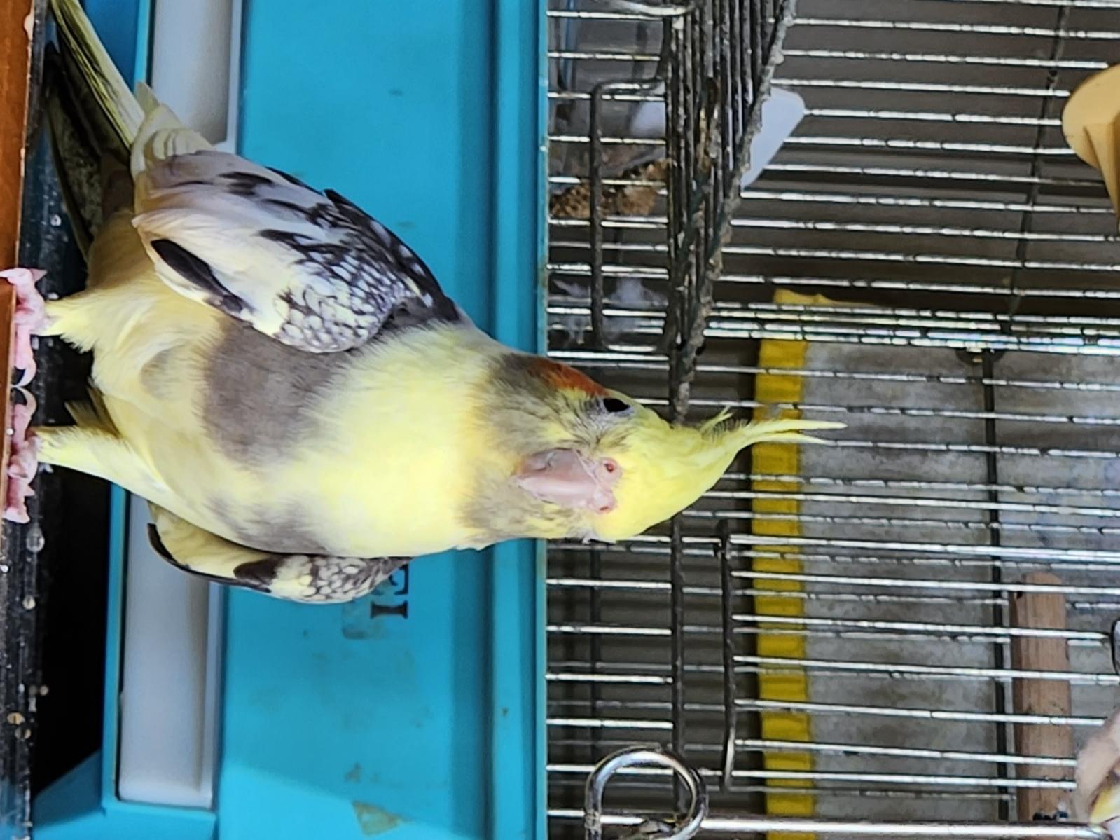 オカメインコ黄色でオレンジのほっぺで嘴付近に少しグレー模様