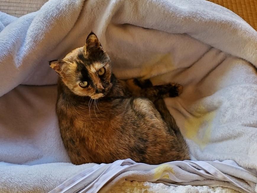 ・鈴のついた赤い首輪着用(写真で着用しているものとは違います)。