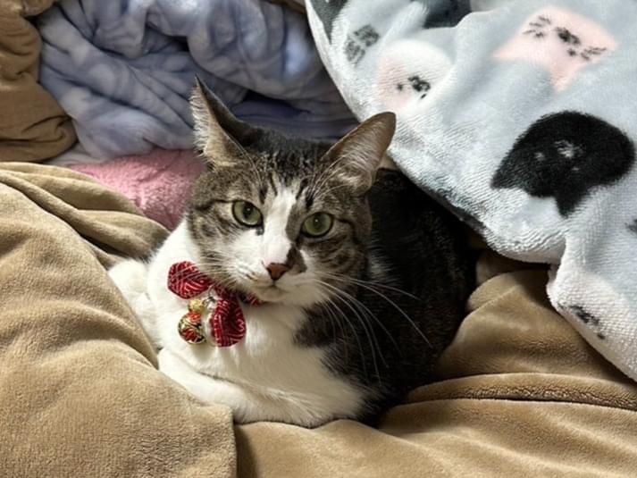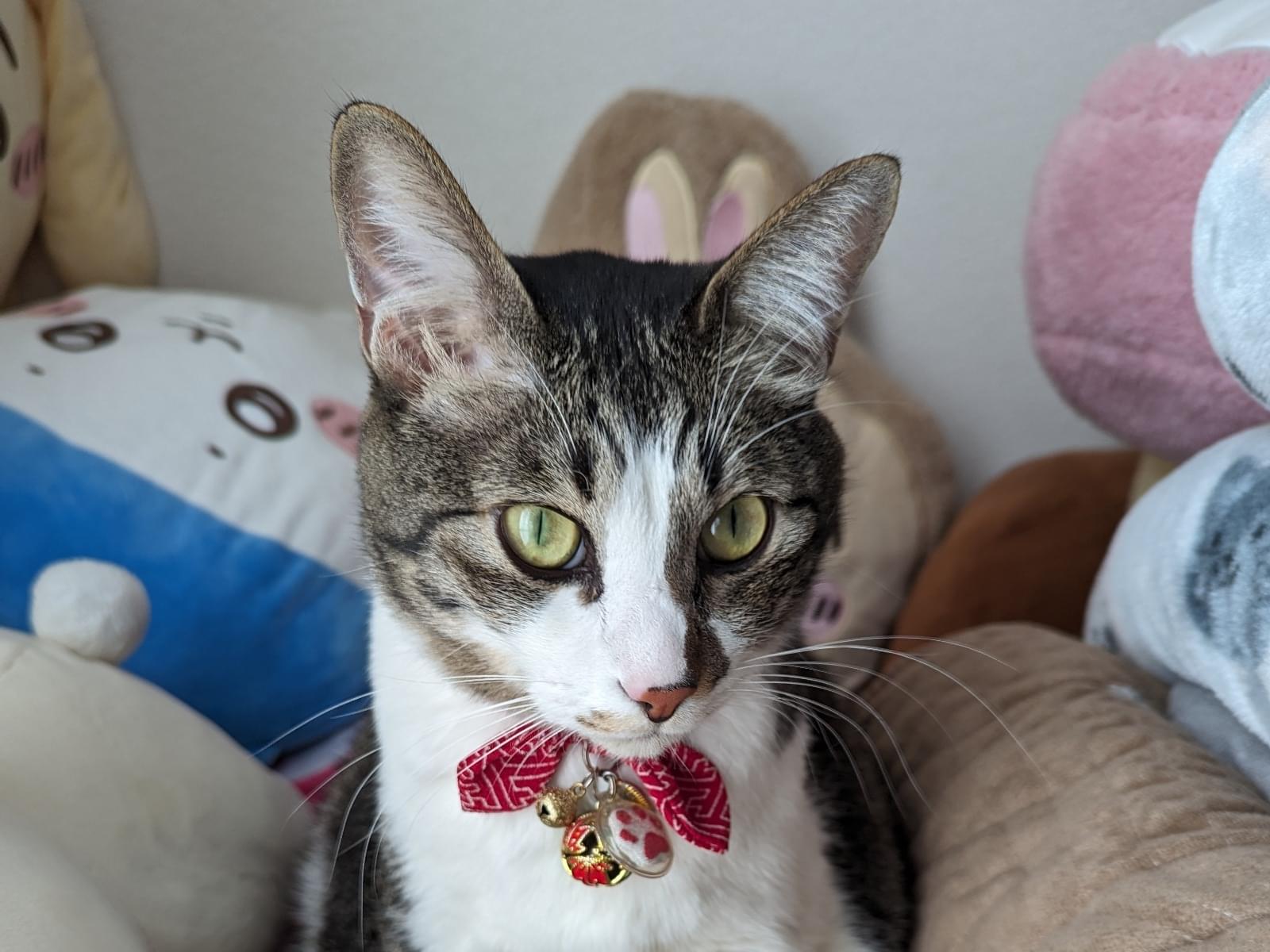 キジ白の男の子で、眉間、口周り、お腹、手足が白です。