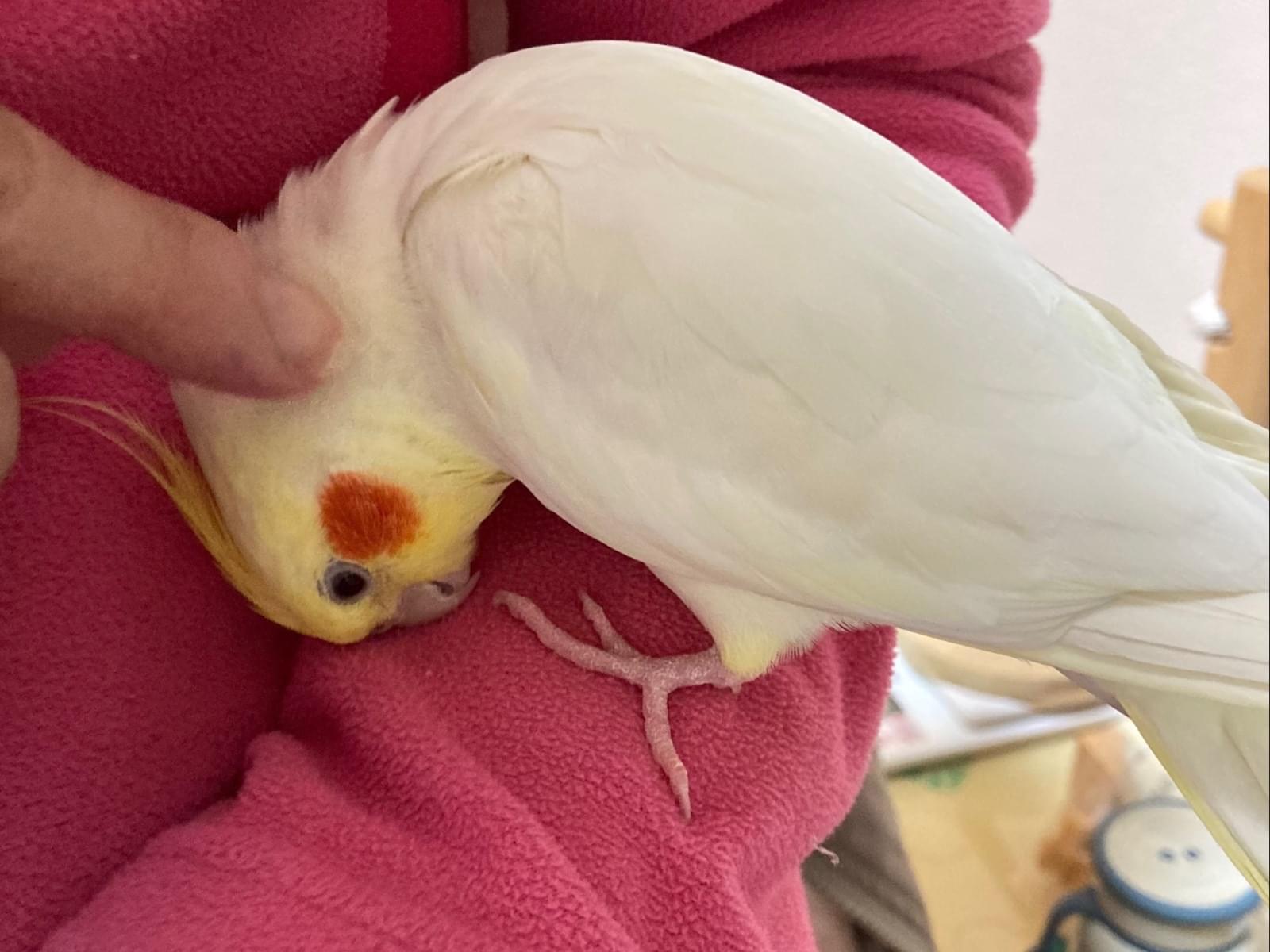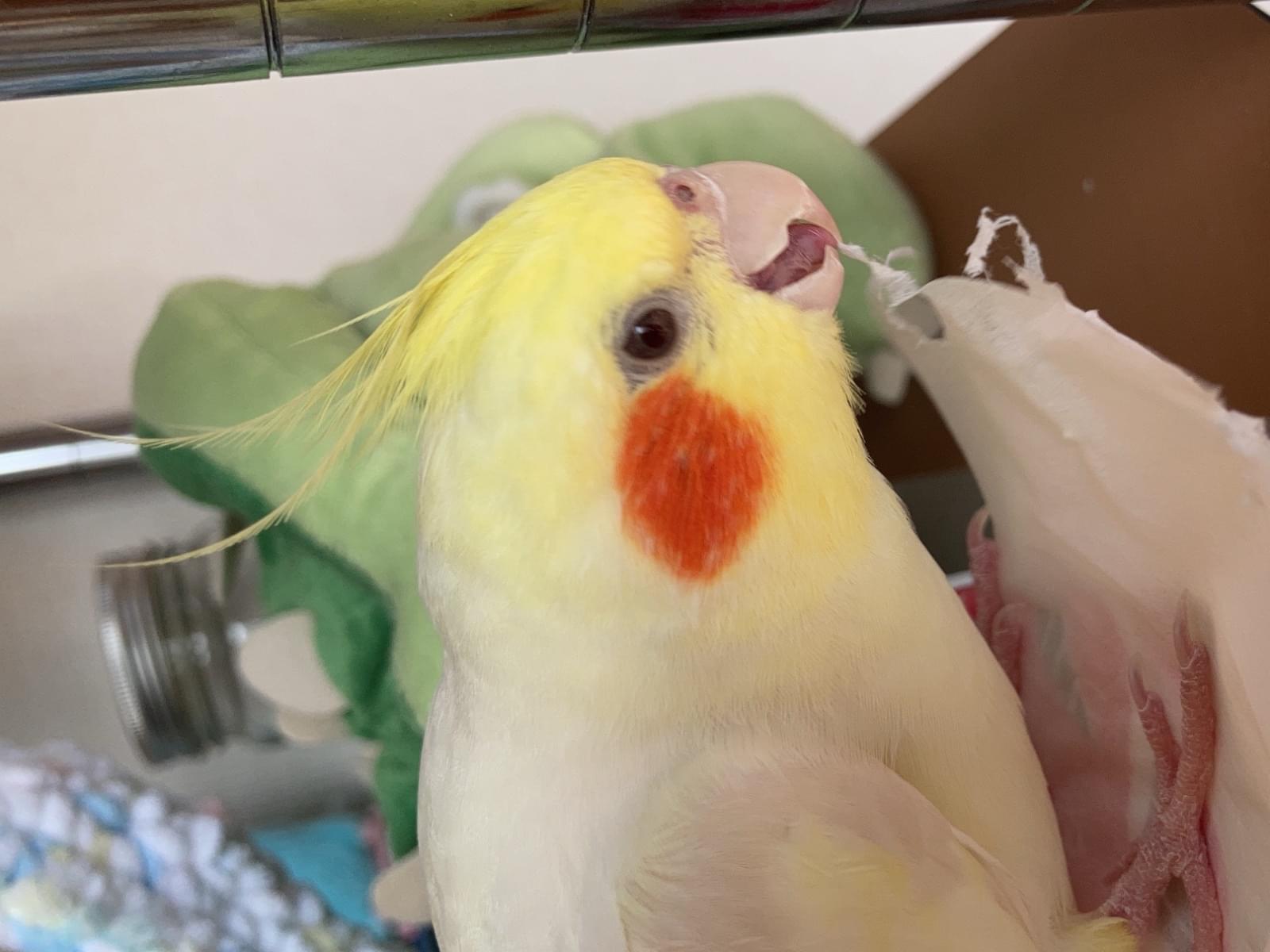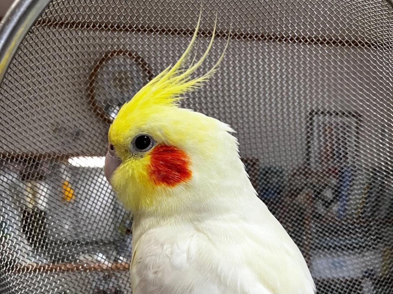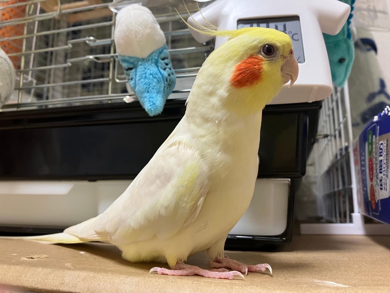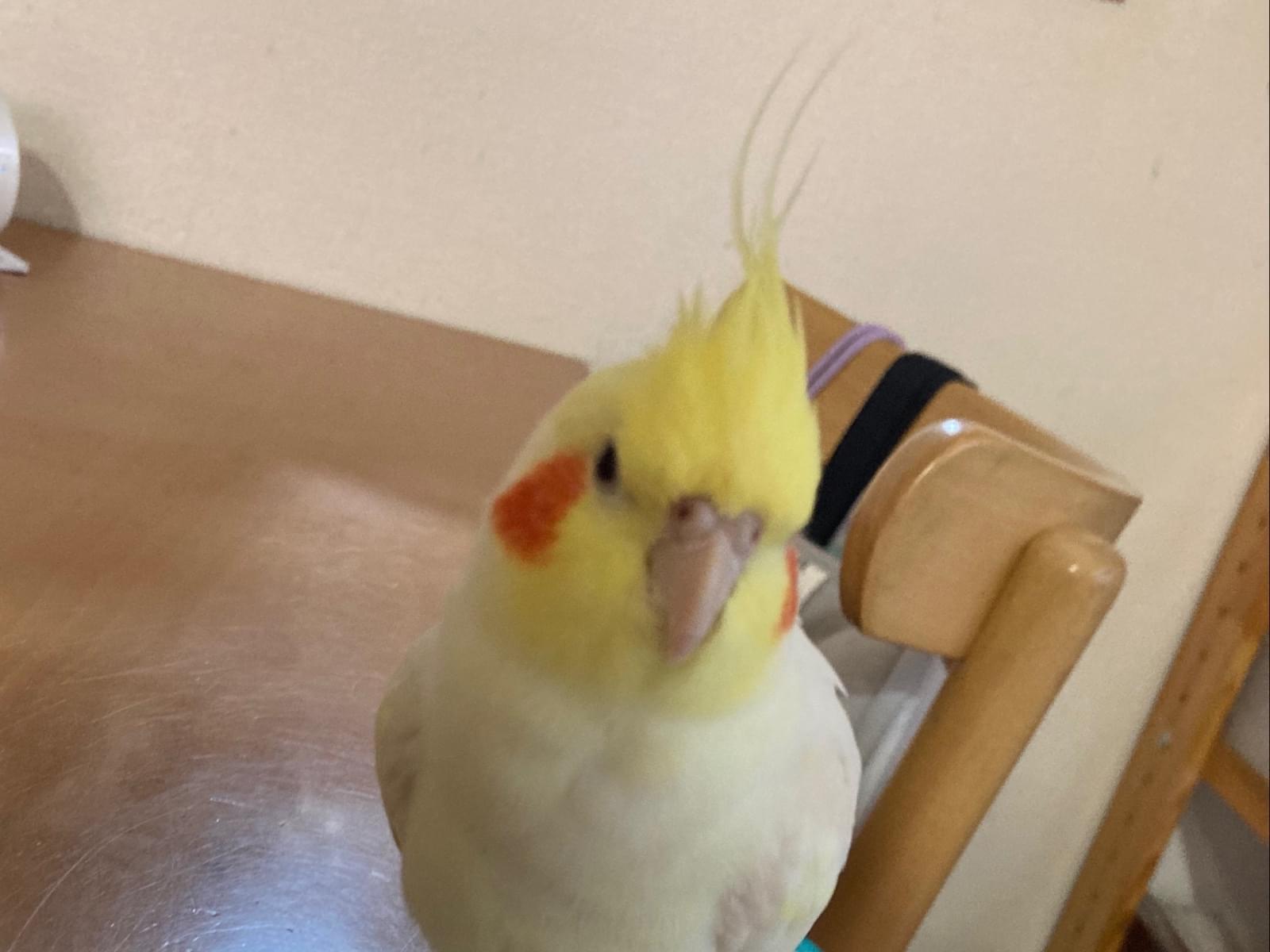 クリーム色に綺麗な黄色の冠羽、くちばし・あし・ツメはピンク色です。