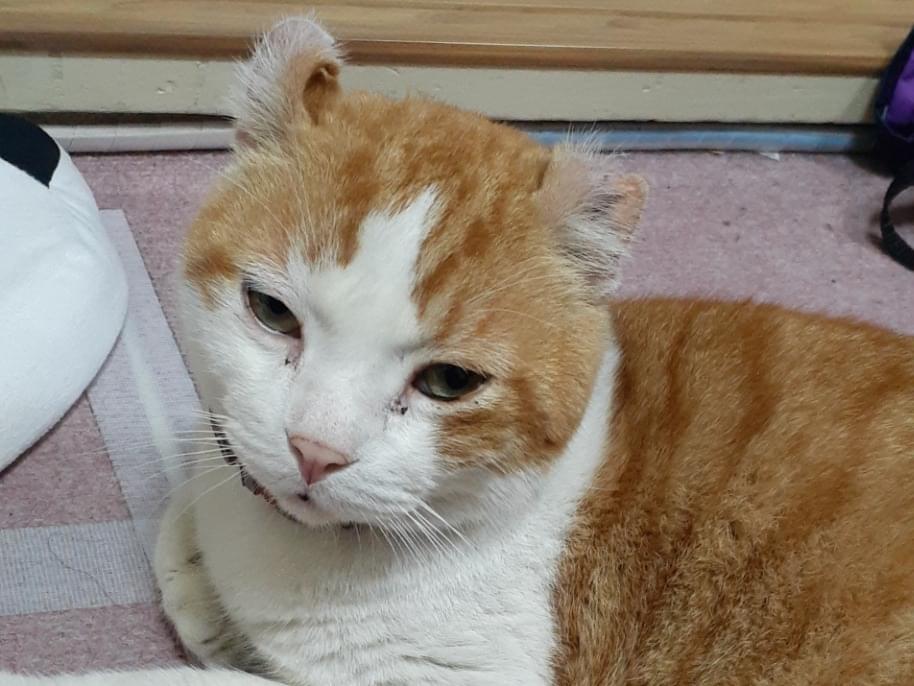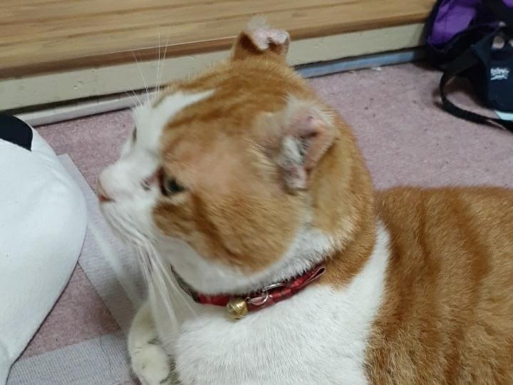 2/21夜、大阪府守口市でアメリカンカールのような耳がクルッとなった茶トラのオス猫を保護しました。