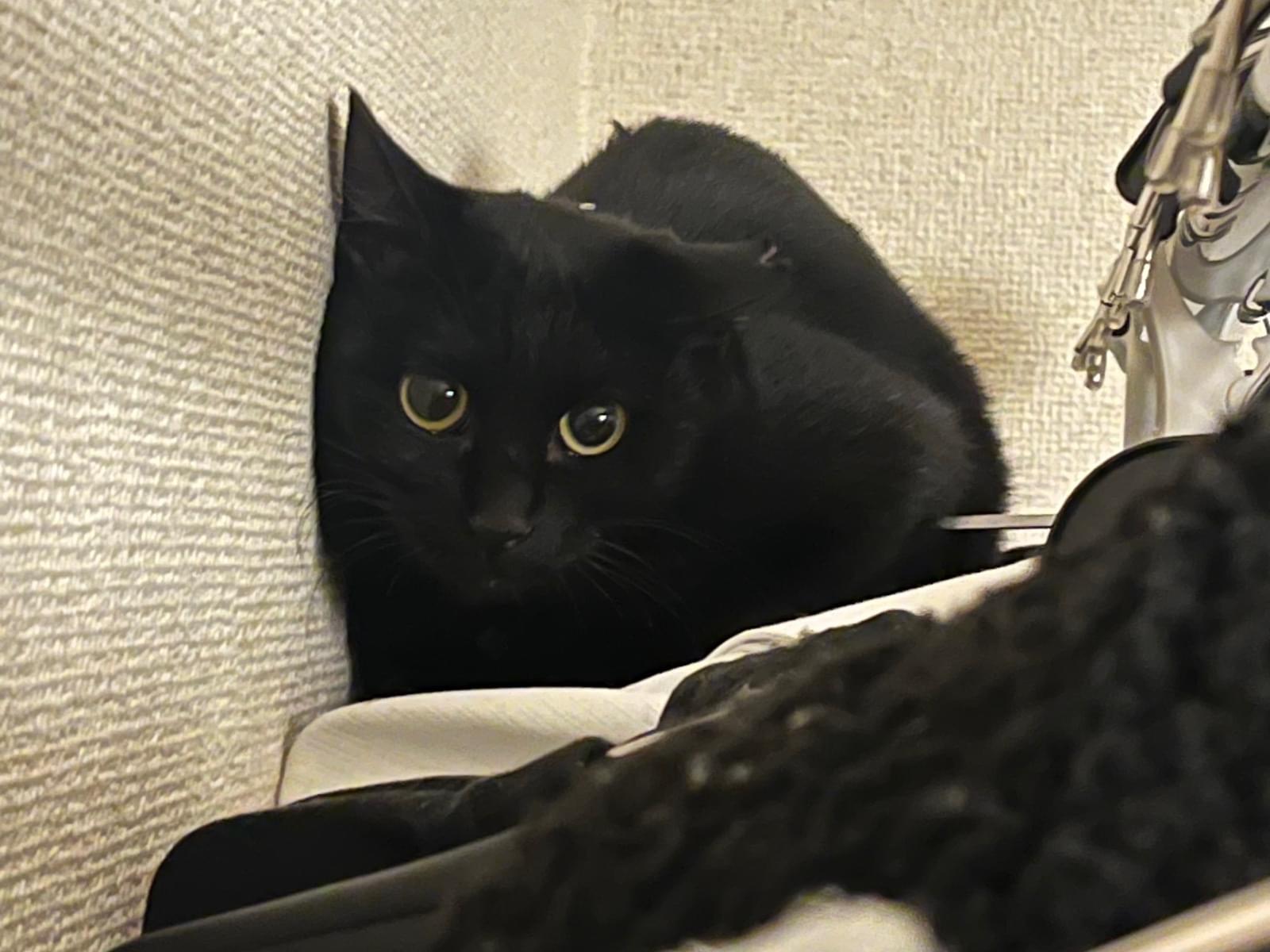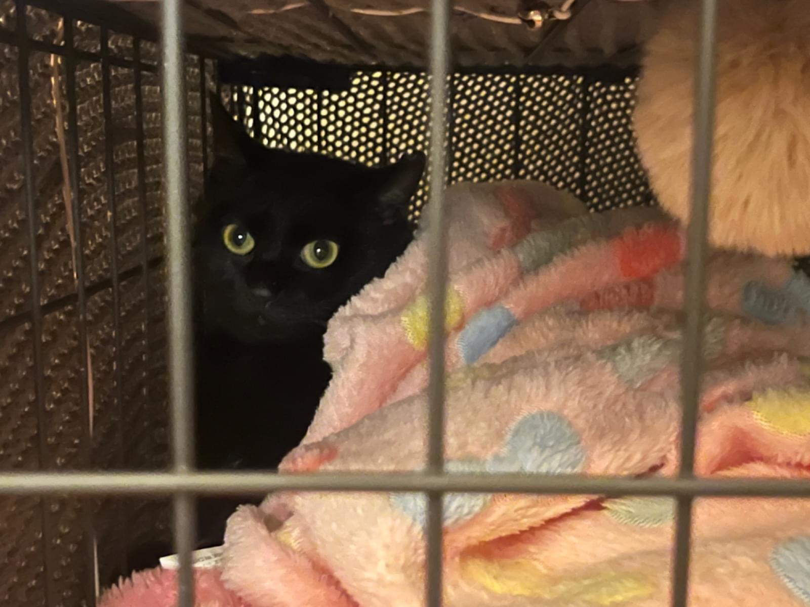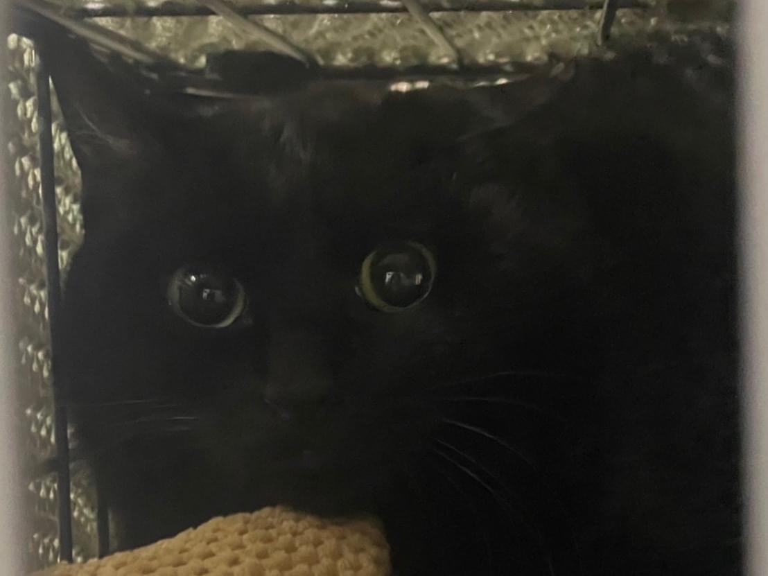 全身黒毛で黒目が丸くて大きく、避妊手術済みのため左の耳先がカットされています。