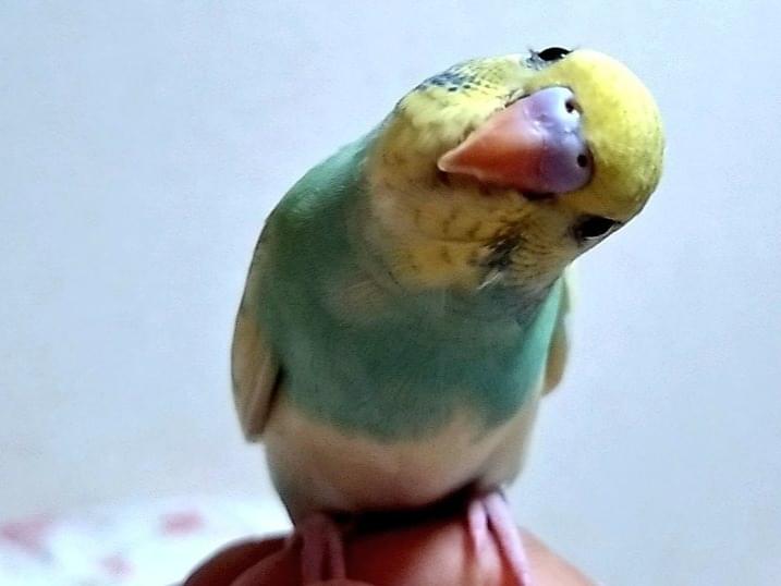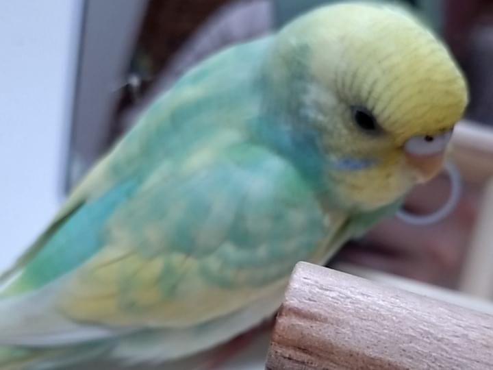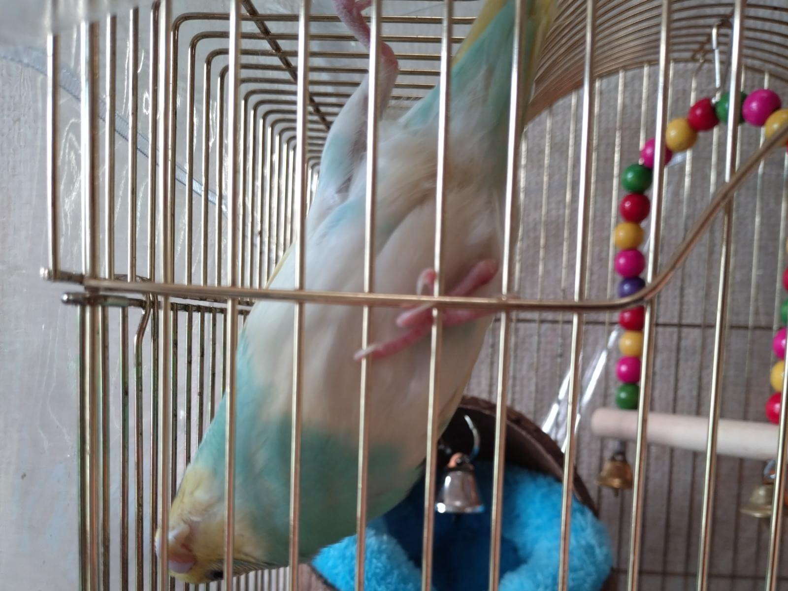 淡いグリーンのレインボーカラーで左右の羽根の模様が若干違います。足に少し水色が入ってます。