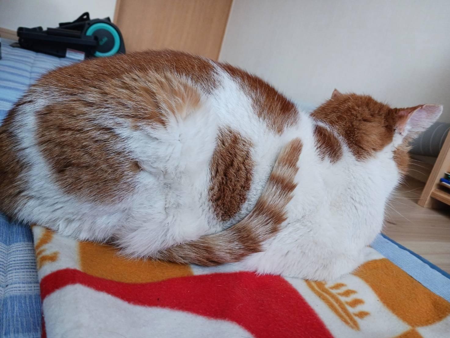 白と茶の雑種、去勢済みの男の子です。顔の口周りの茶模様と右口元の点の様な茶模様が特徴的です。小型犬より大きめで尻尾は長めです。