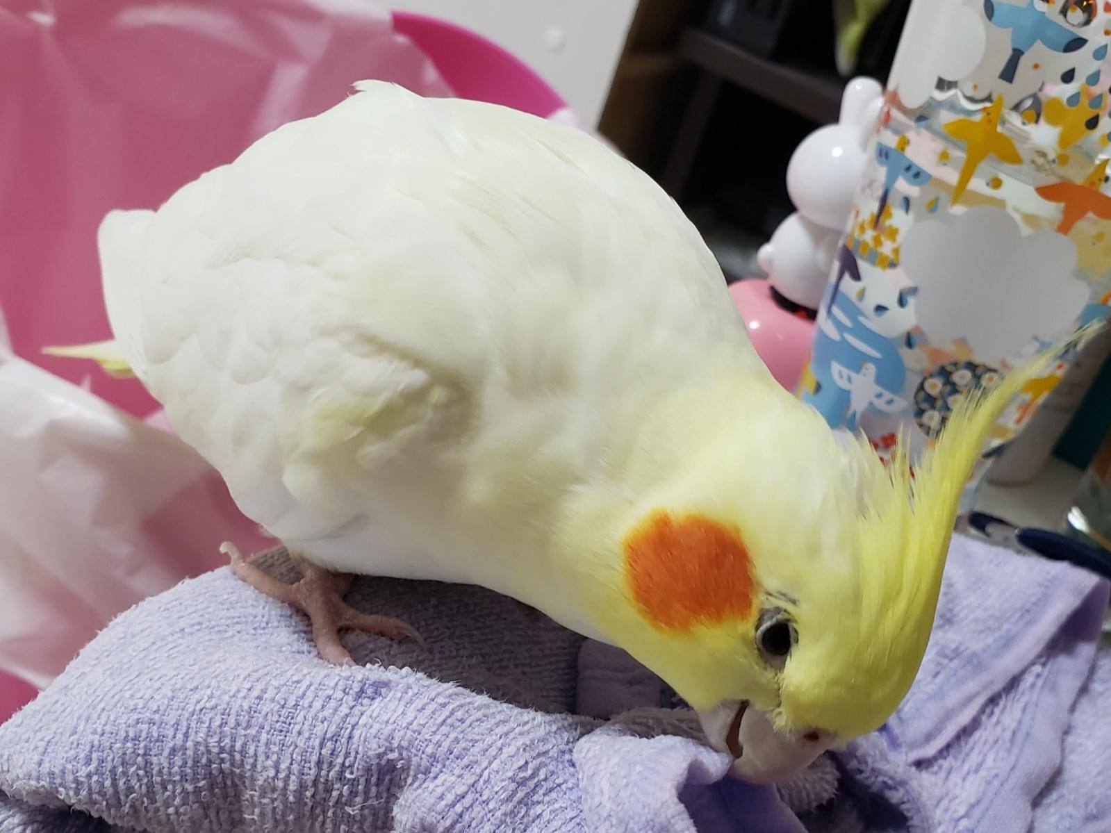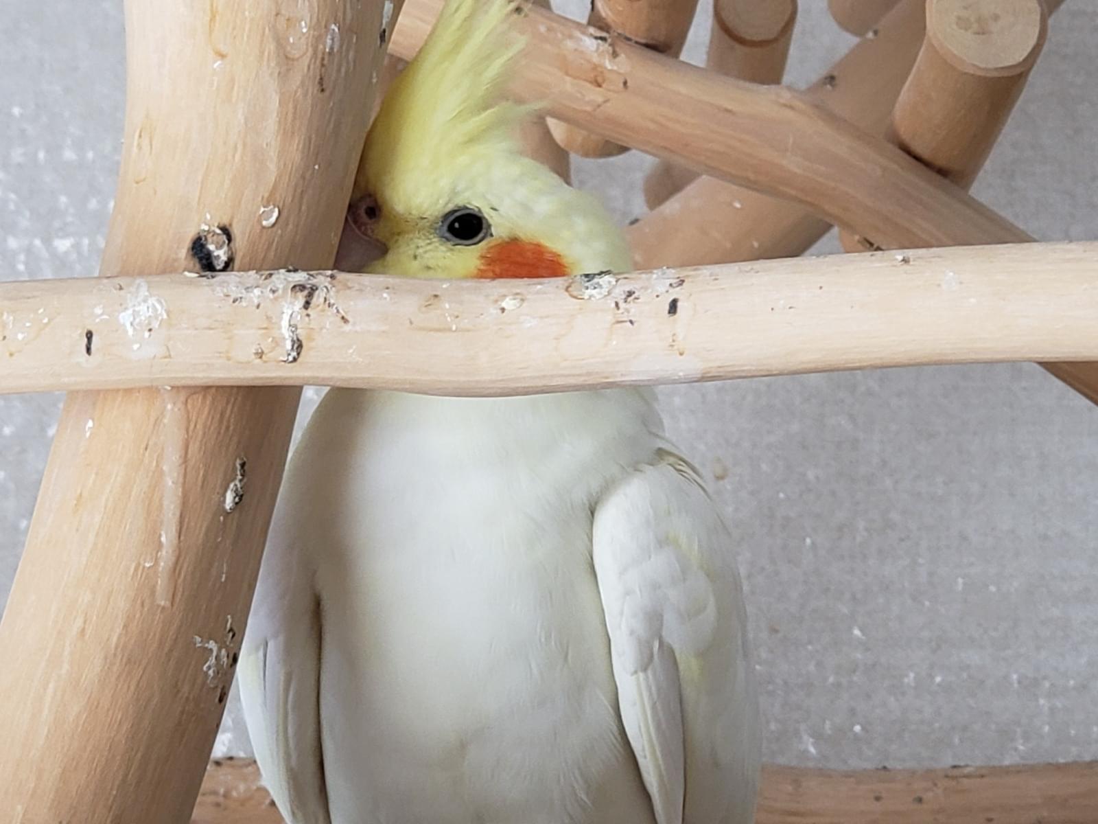 ルチノーで頭の黄色のトサカが短く、オレンジほっぺをしています。大人しい人懐こい子です。