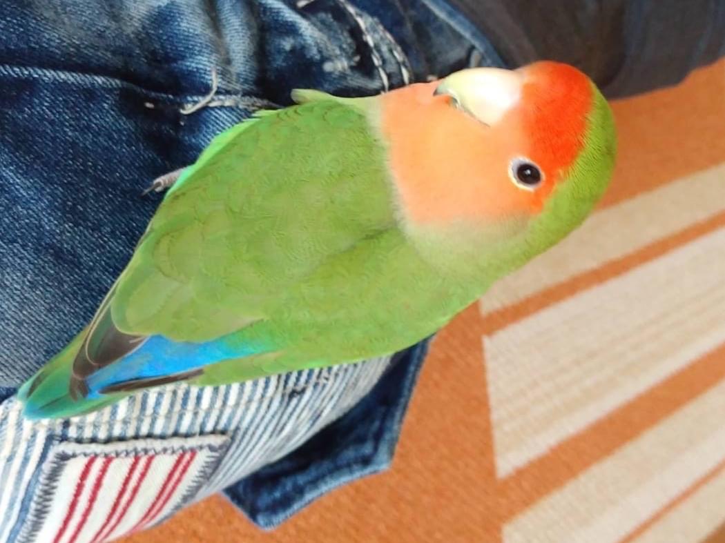 3/12(火)午後12時15分頃、お外に遊びに行きました。体は緑色で、お顔はオレンジ色です。尾は青と少し黒が混じっています。お顔と体の境目がきれいで前髪ぱっつんのようです。