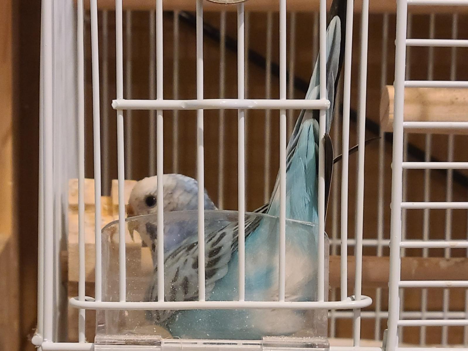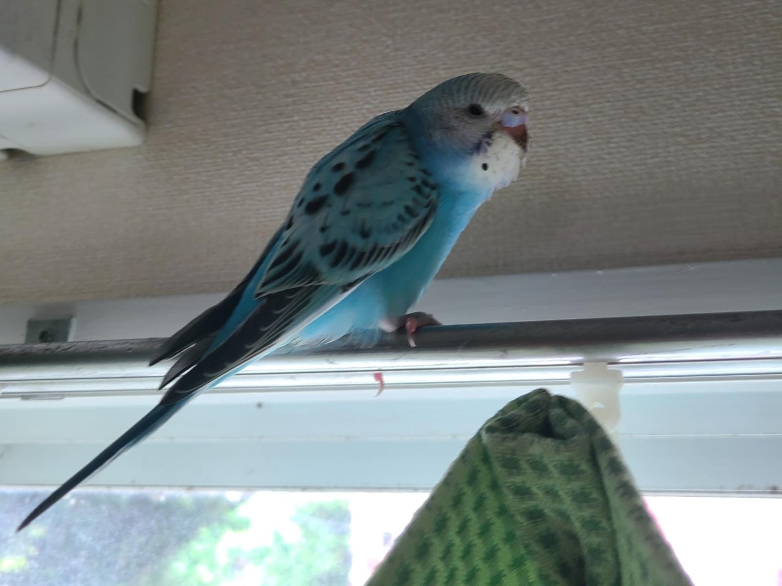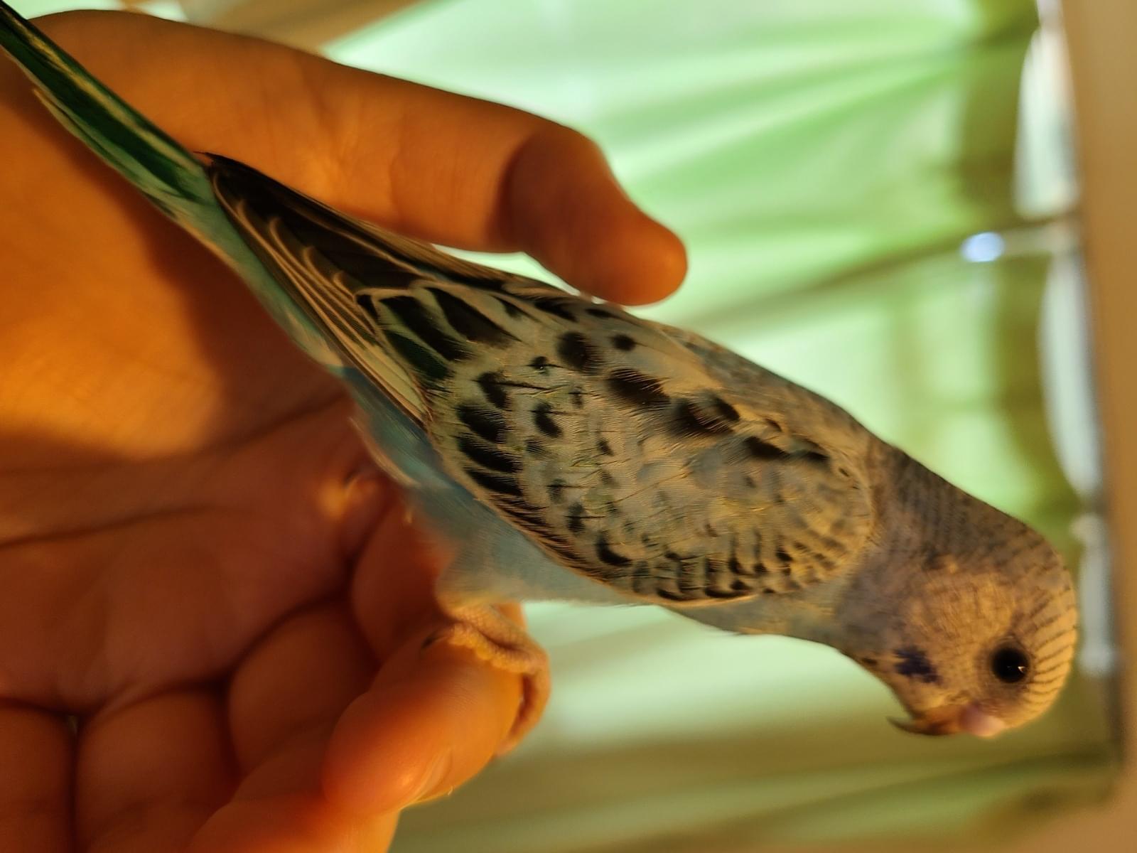 青色の体と首元に黒い点があるセキセイインコを探しています