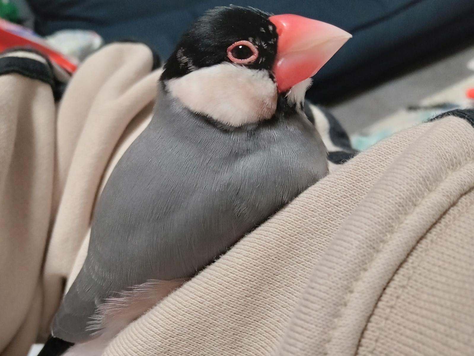 頭は黒、くちばしはピンク、体はグレー、尻尾は黒の桜文鳥です。人懐っこく、指や肩に止まります。