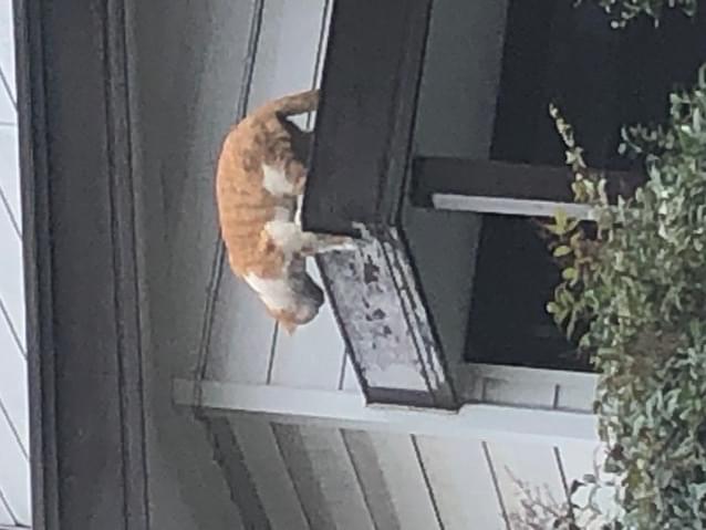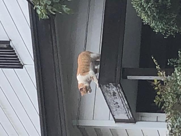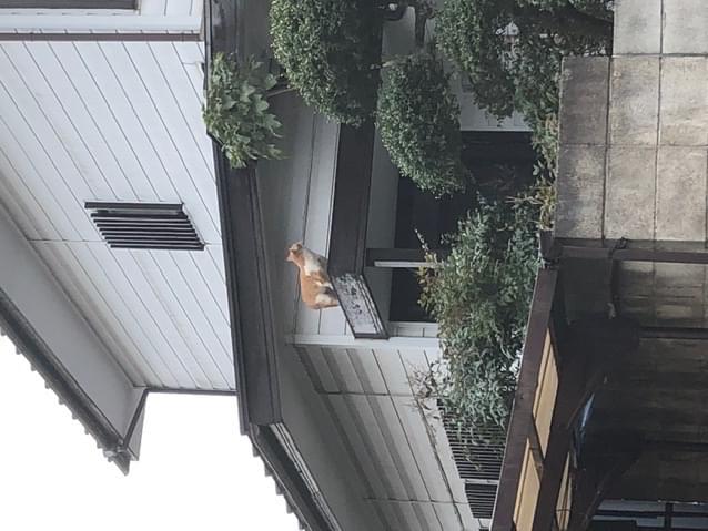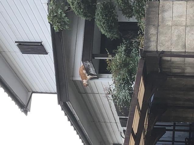 屋根の上で降りるのをためらうように鳴いているところを見つけました。