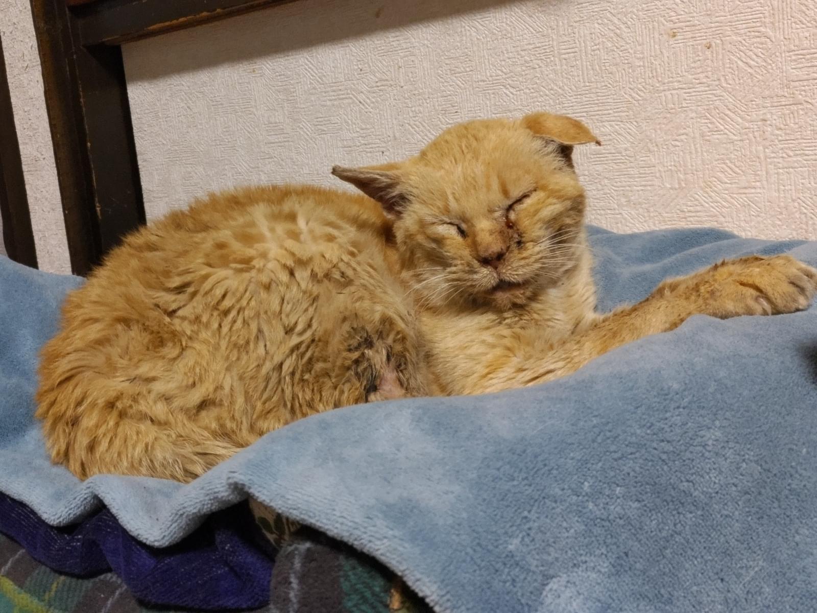 ▪老猫なので毛並みが悪く、涙とよたれで顔が汚れています。