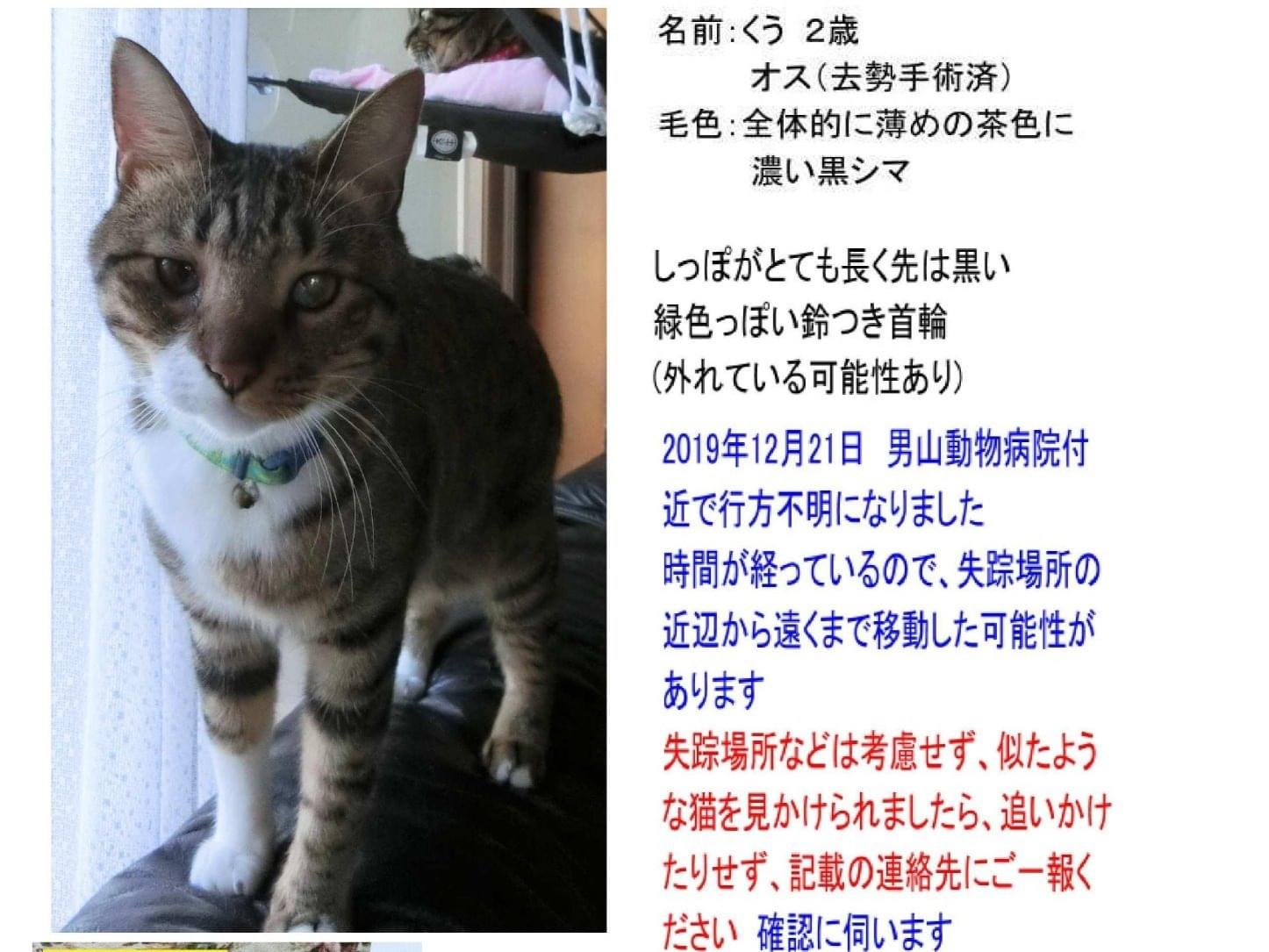 失踪場所などは考慮せず、似たような猫を見かけたら、追いかけたりせずに連絡先までご一報下さい。