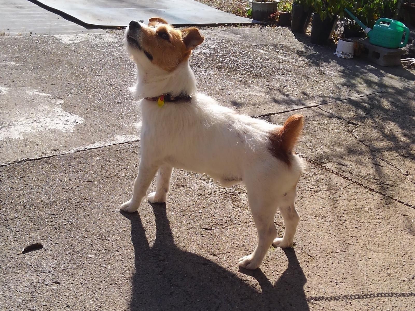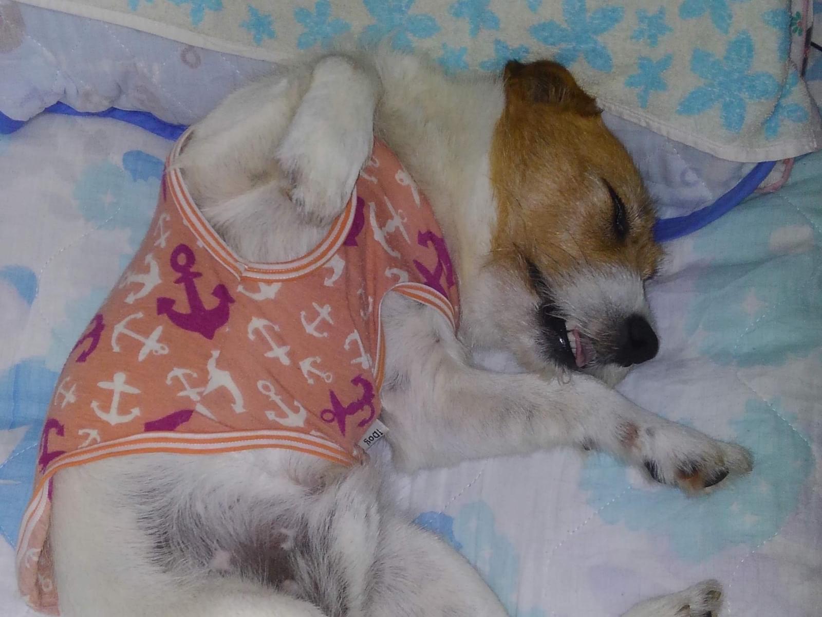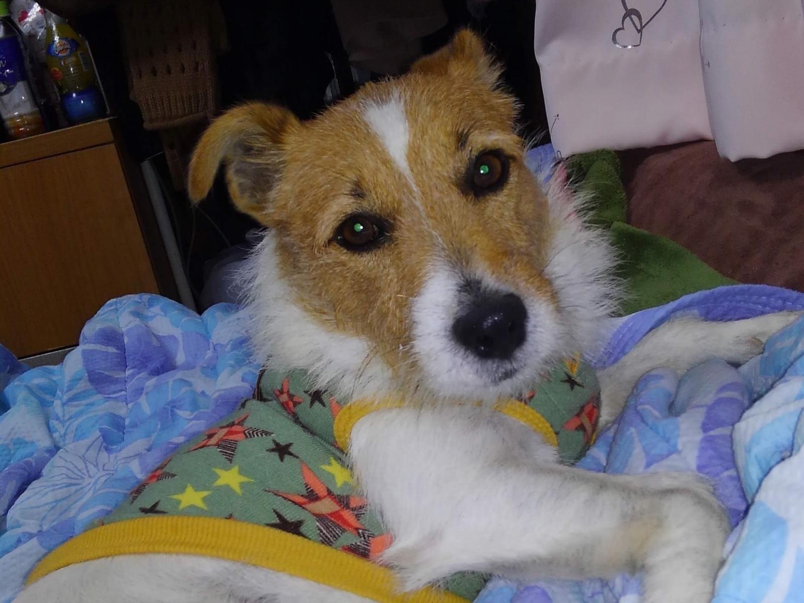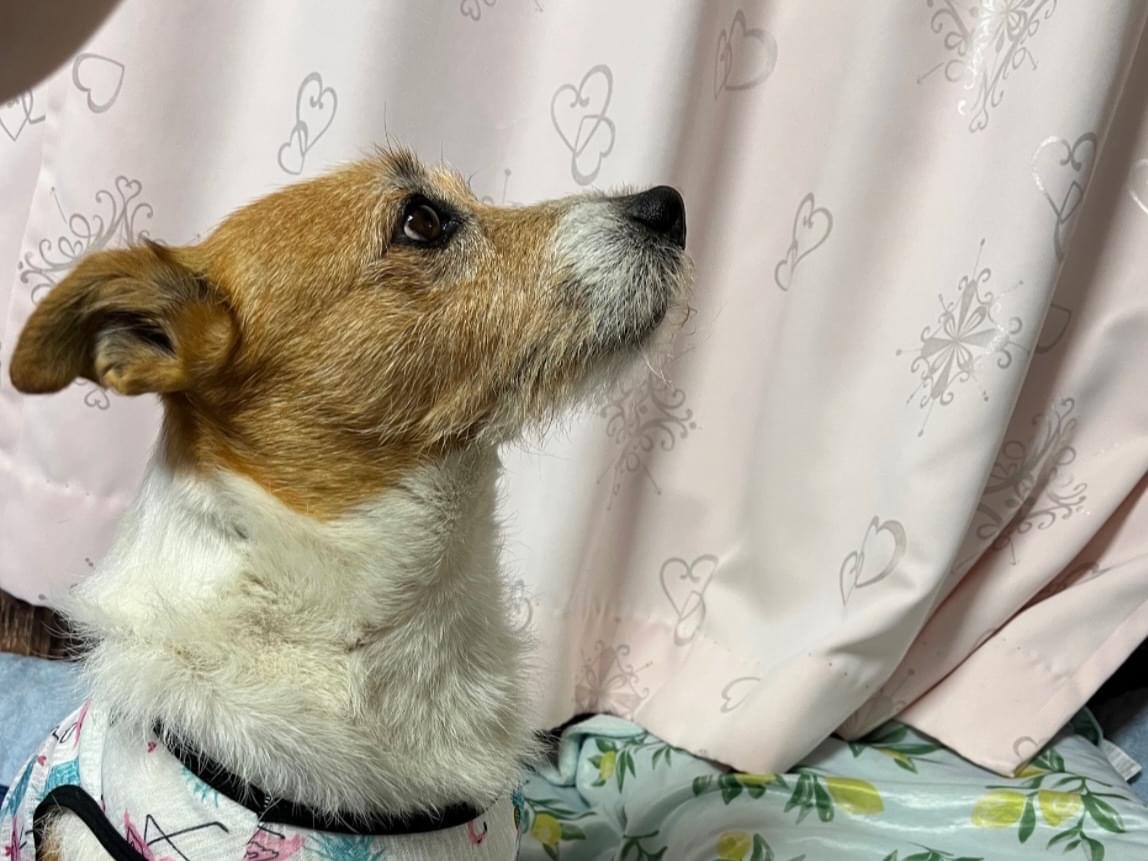 迷子になった時は薄い緑色のドット柄の洋服を着ていました。しっぽは断尾しています。左の耳が浮いてます。