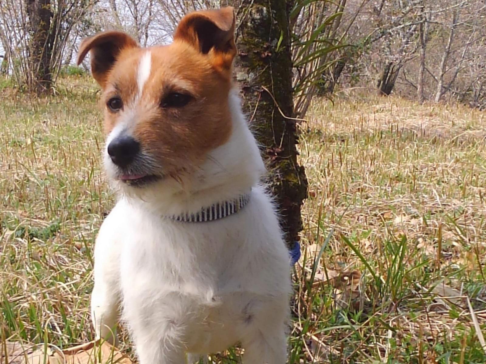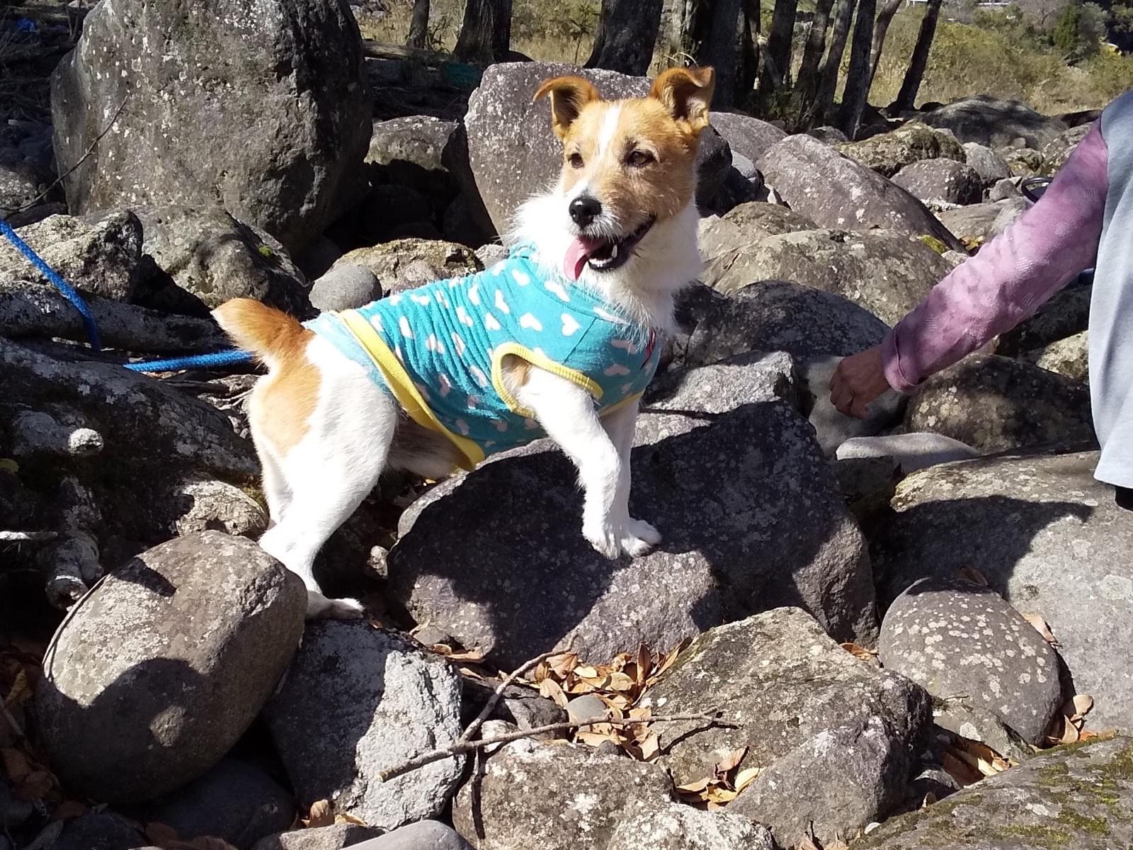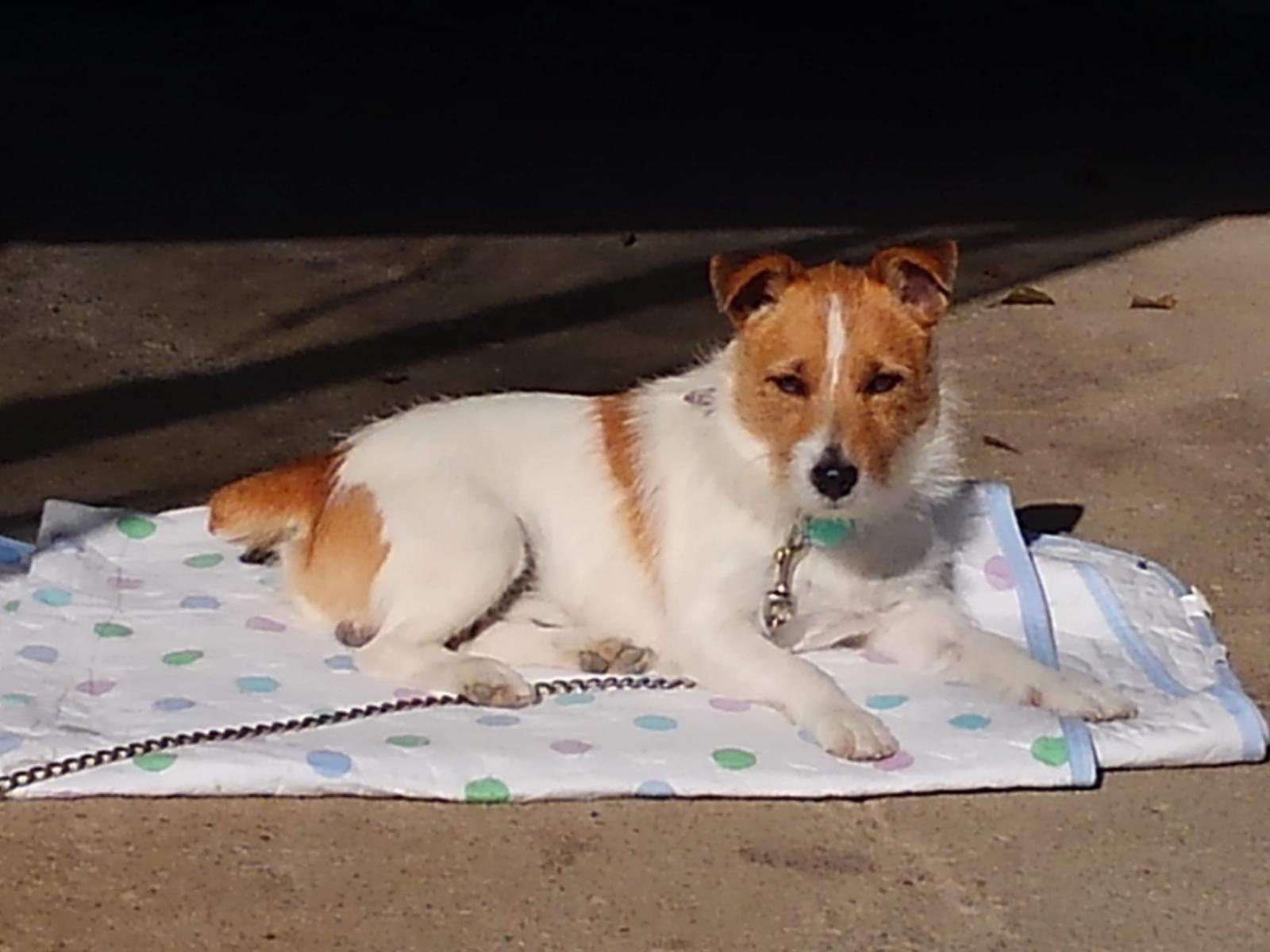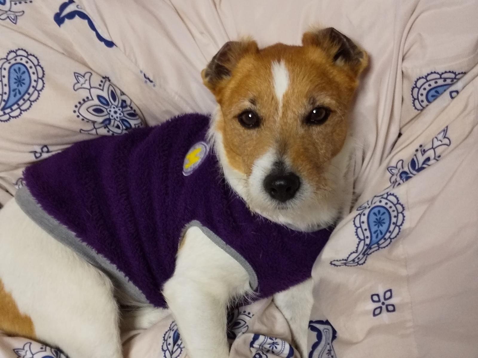 迷子になった時は薄い緑色のドット柄の洋服を着ていました。しっぽは断尾しています。左の耳が浮いてます。