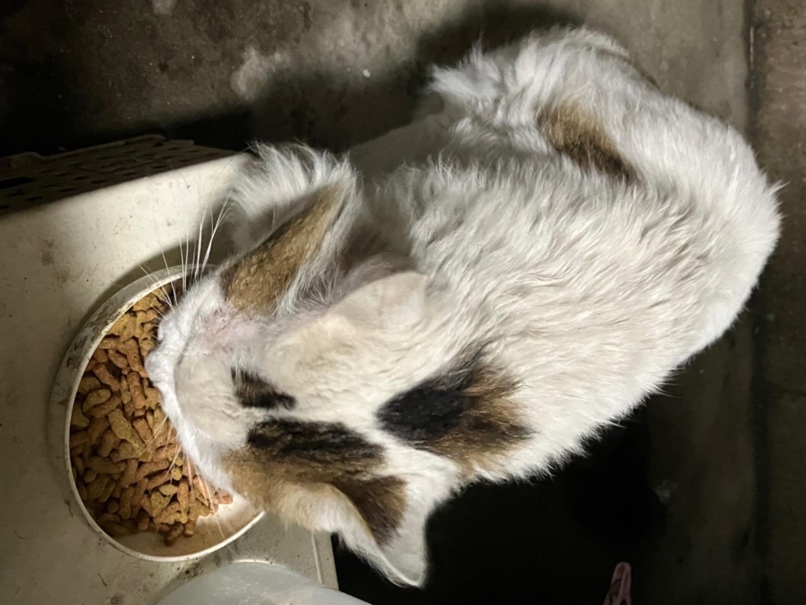 白地に三毛っぽいブチのメインクーン風の猫ちゃんです。尻尾は縞々でふさふさで長いです。