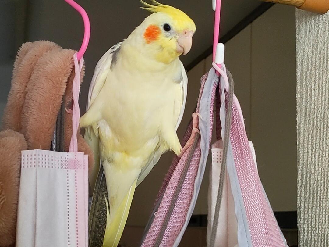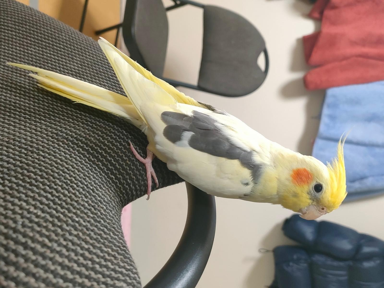 背中はグレー全体的にはイエローでほっぺが鮮やかな濃いオレンジです。
