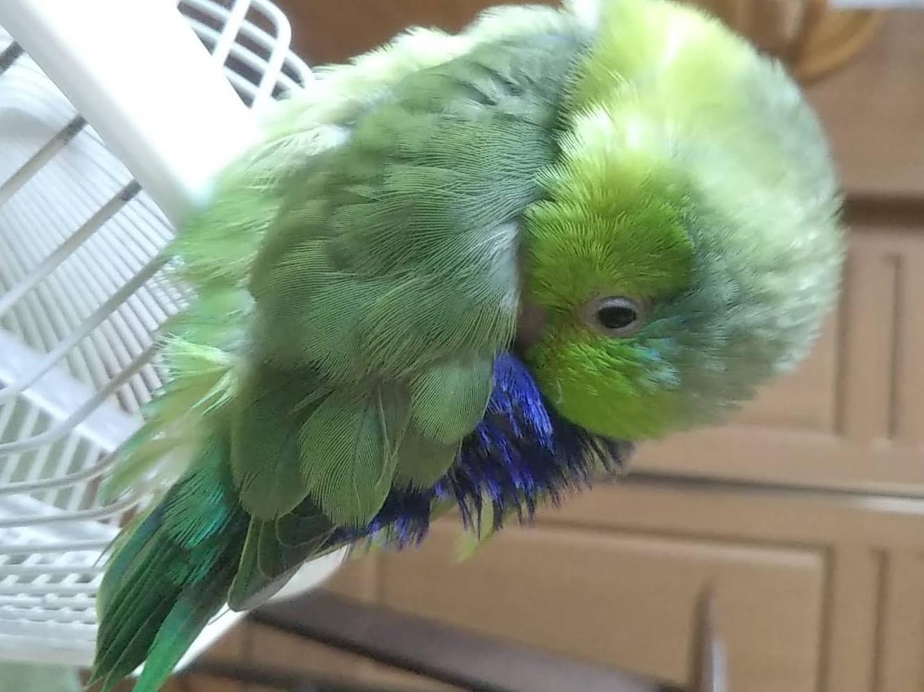 セキセイインコと違ってしっぽが短いです。オスのため、全体的には緑色ですが、羽の下が青いです。