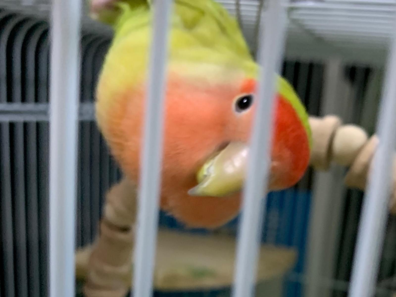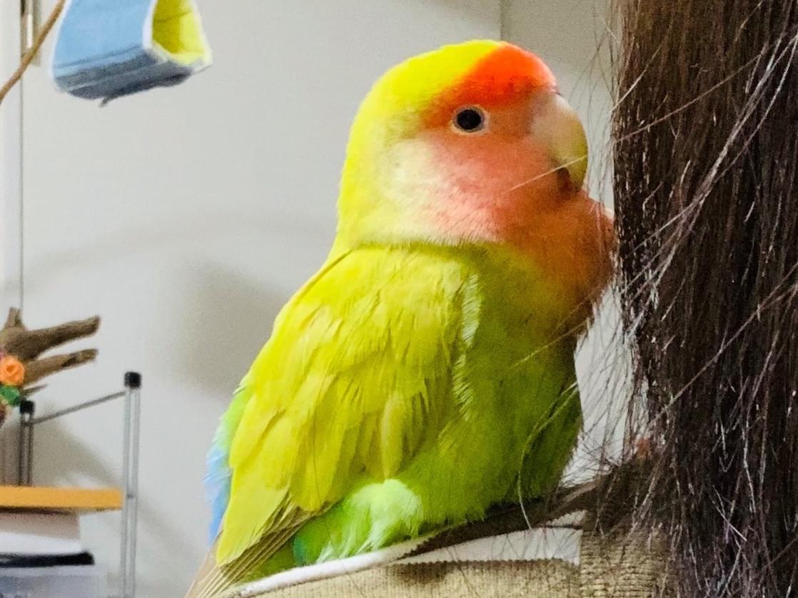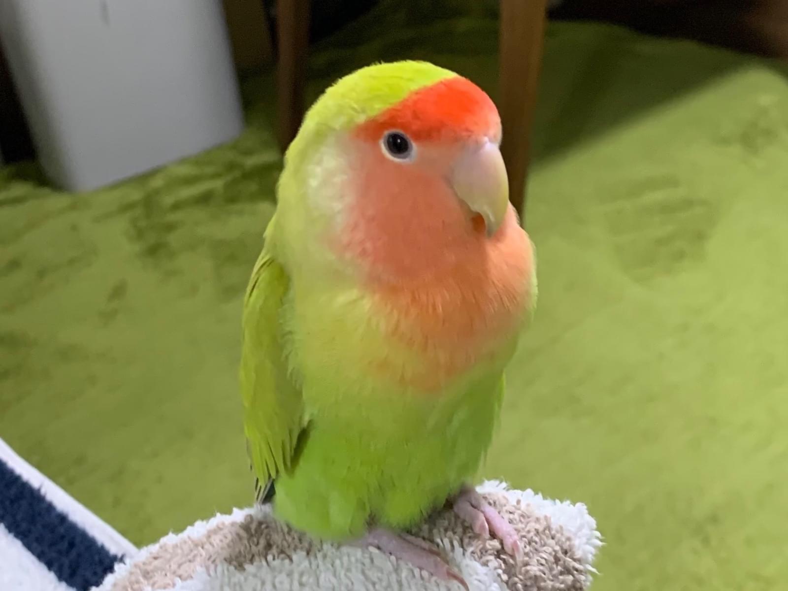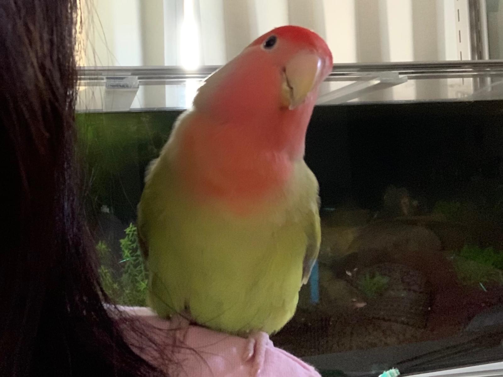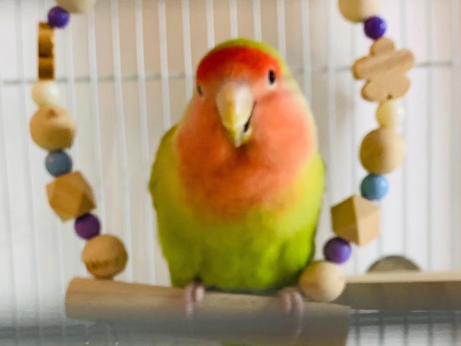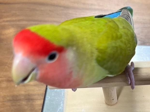 体が緑、顔が赤、尾羽が青のコザクラインコ♀です。