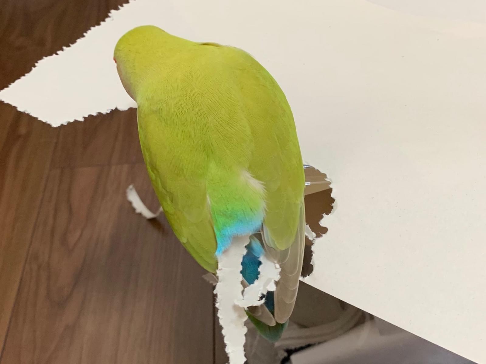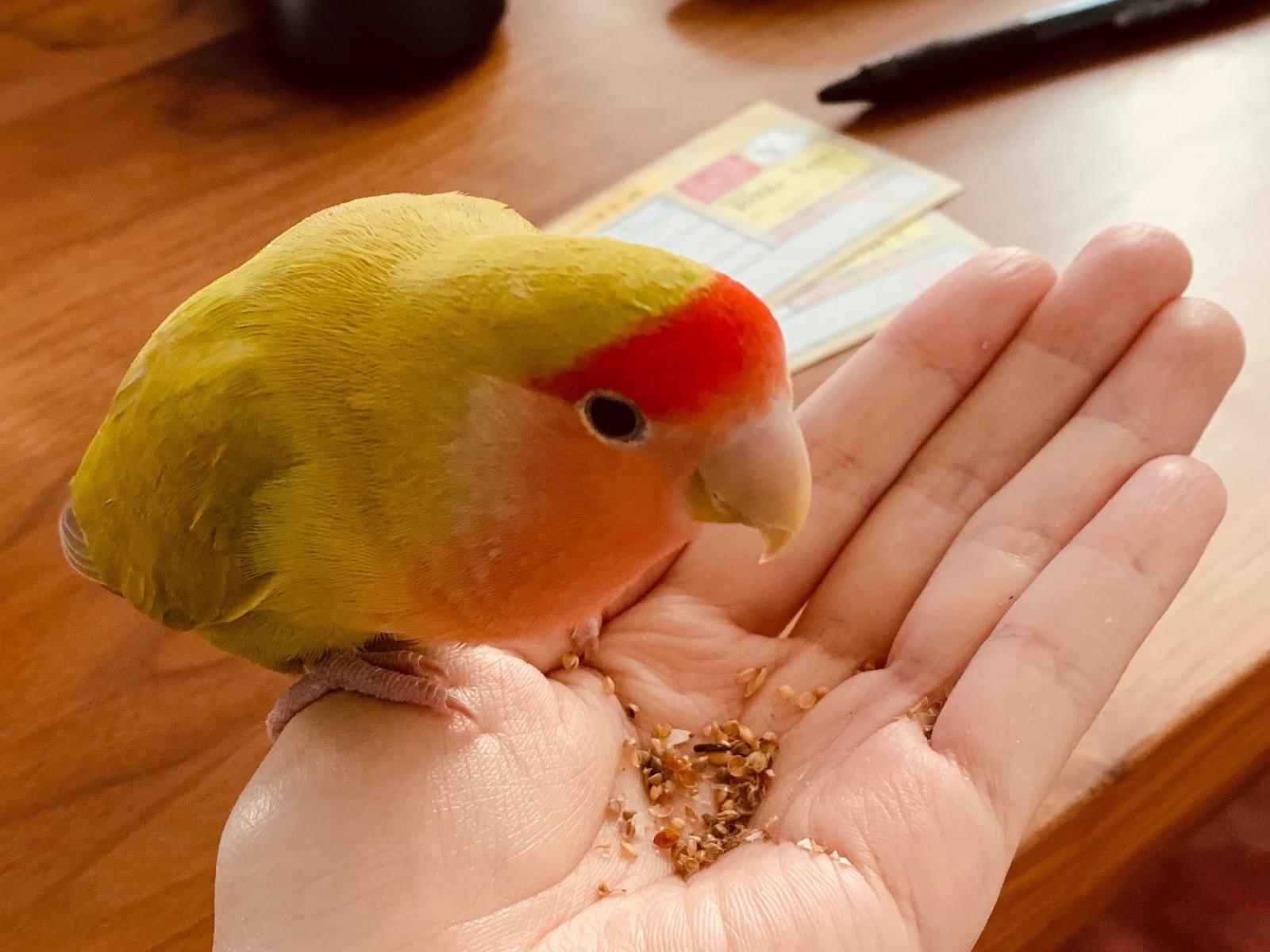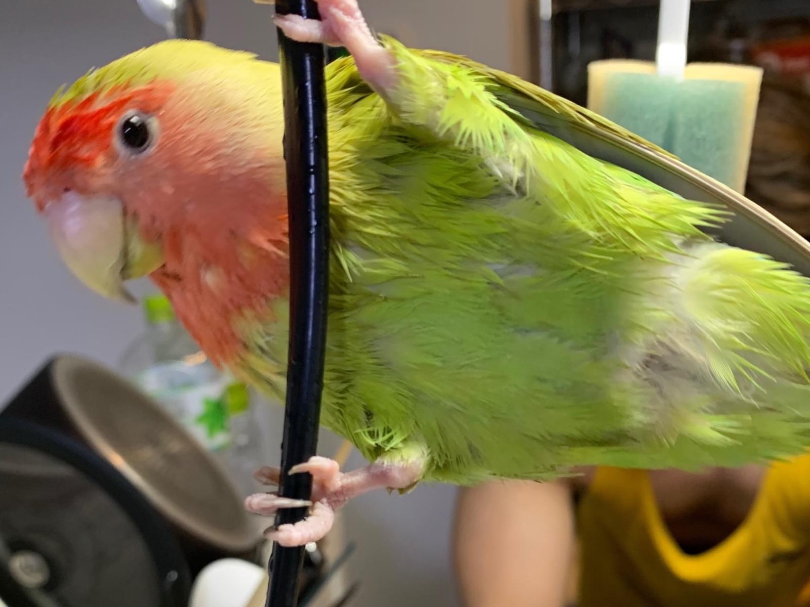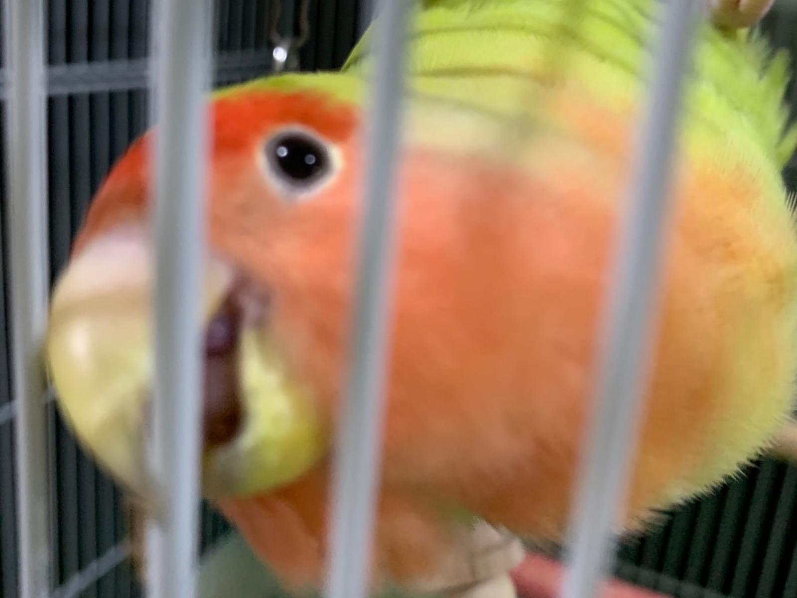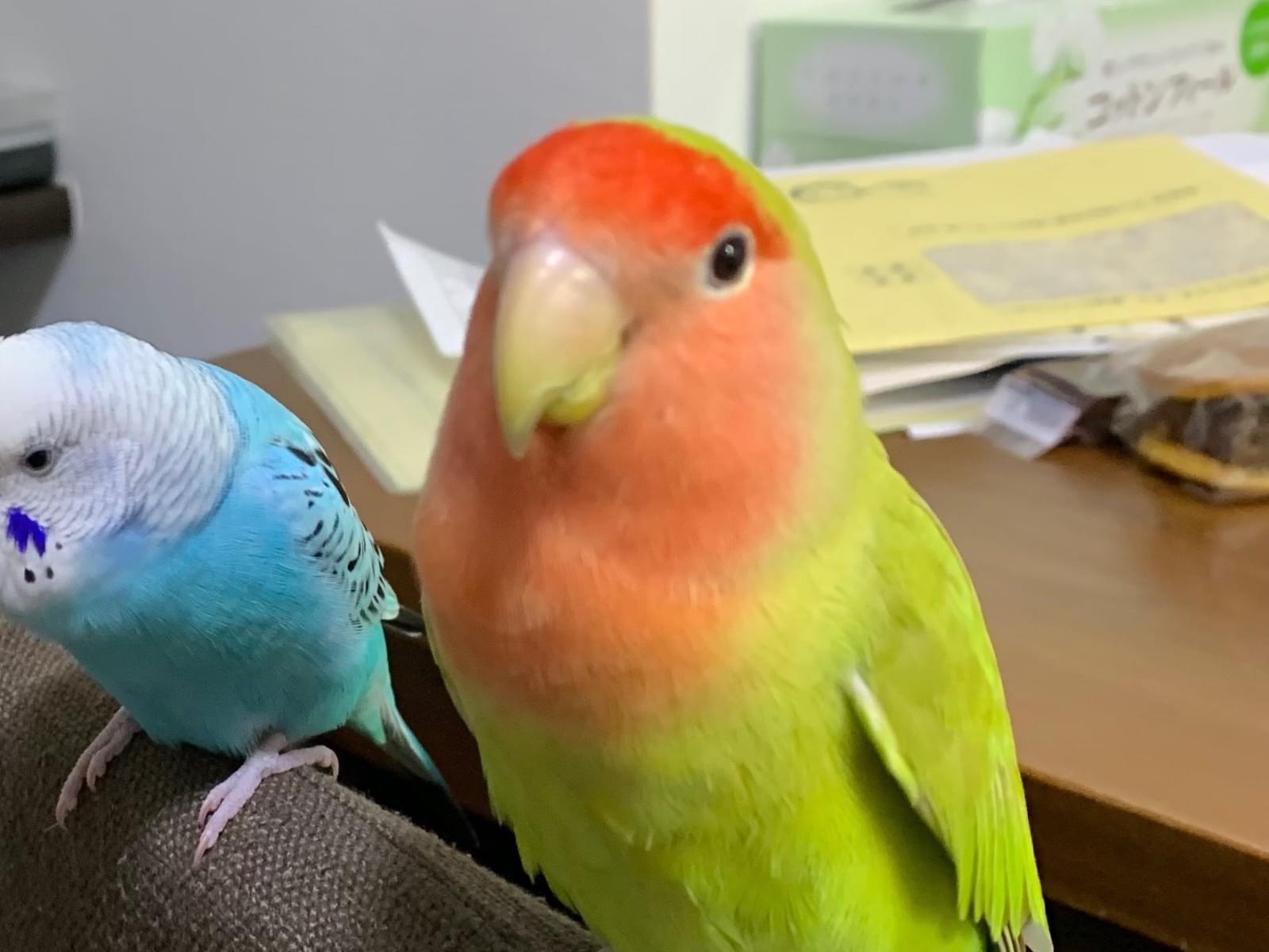 体が緑、顔が赤、尾羽が青のコザクラインコ♀です。