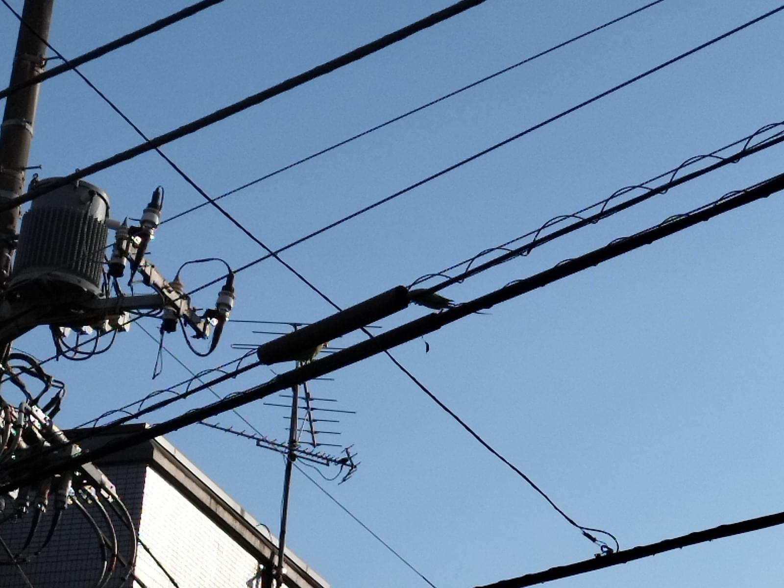 緑と黄色のコザクラインコのような鳥が電線に2羽とまっていました。高くて届かなかったので保護はできませんでしたが、写真は撮れました。逆光で見にくいですが、緑と黄色でした。